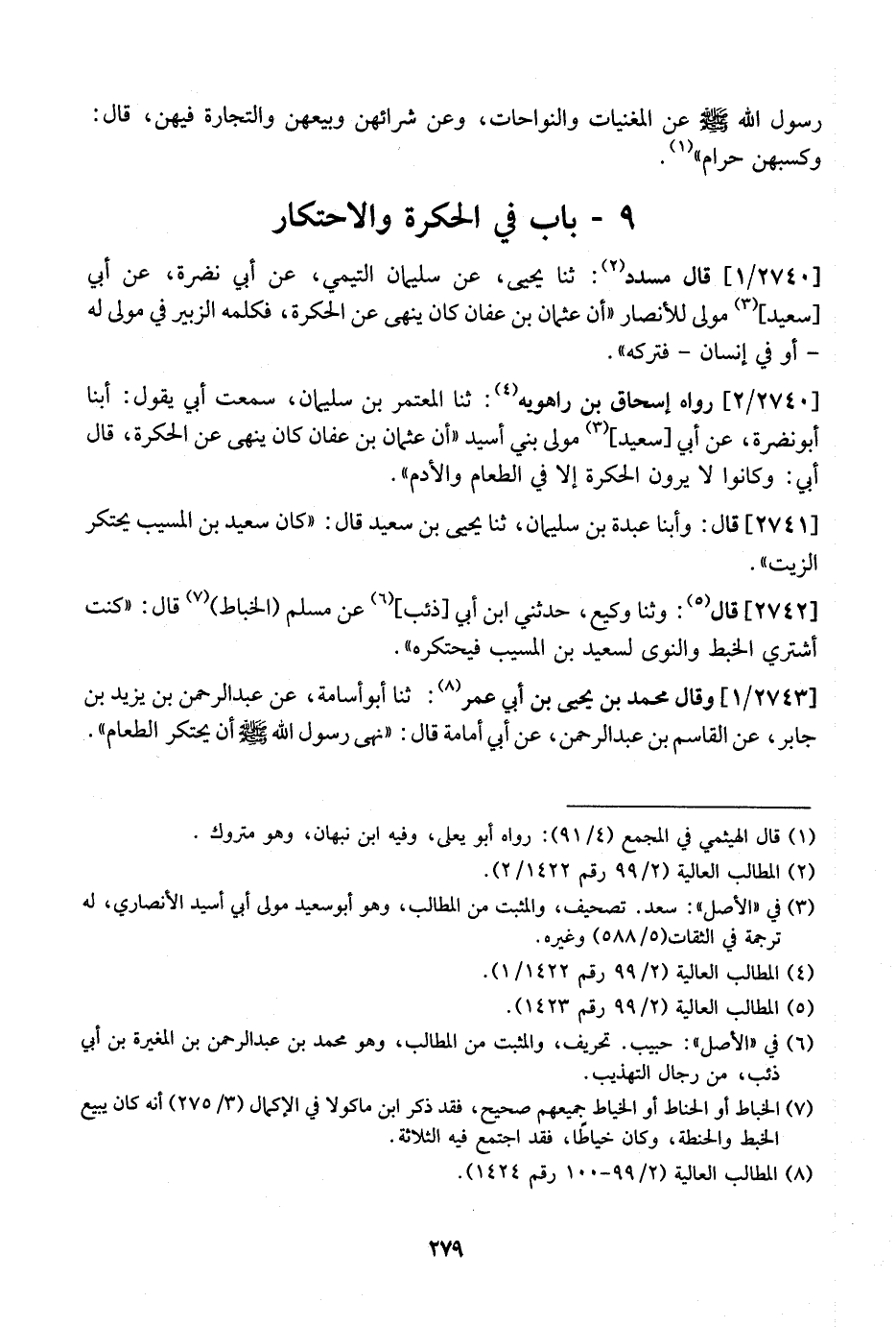2740 / 1 - قَالَ مُسَدَّدٌ: ثنا يَحْيَى، عَنْ سُلَيْمَانَ التَّيْمِيِّ، عَنْ أَبِي نَضْرَةَ، عَنْ أَبِي سَعِيدٍ مَوْلَى للأنصار "أَنَّ عُثْمَانَ بْنَ عَفَّانَ كَانَ يَنْهَى عَنِ الْحُكْرَةِ، فَكَلَّمَهُ الزُّبَيْرُ فِي مَوْلًى لَهُ - أَوْ فِي إِنْسَانٍ- فَتَرَكَهُ ".