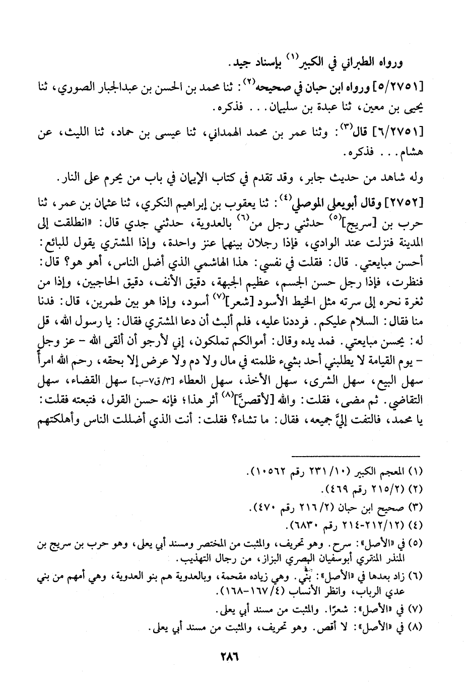2752 - وَقَالَ أَبُو يَعْلَى الْمَوْصِلِيُّ: ثَنَا يَعْقُوبُ بْنُ إِبْرَاهِيمَ النَّكْرِيُّ، ثَنَا عُثْمَانُ بْنُ عُمَرَ، ثَنَا حَرْبُ بْنُ سُرَيْجٍ حَدَّثَنِي رجل من بالعدوية، حَدَّثَنِي جَدِّي قَالَ: "انْطَلَقْتُ إِلَى الْمَدِينَةِ فَنَزَلْتُ عِنْدَ الْوَادِي، فَإِذَا رَجُلَانِ بَيْنَهُمَا عَنْزٌ وَاحِدَةٌ، وَإِذَا الْمُشْتَرِي يَقُولُ لِلْبَائِعِ: أَحْسِنْ مُبَايَعَتِي. قَالَ: فَقُلْتُ فِي نَفْسِي: هَذَا الْهَاشِمِيُّ الَّذِي أَضَلَّ النَّاسَ، أَهُوَ هُوَ؟ قَالَ: فَنَظَرْتُ، فَإِذَا رَجُلٌ حَسَنُ الْجِسْمِ، عَظِيمُ الْجَبْهَةِ، دَقِيقُ الْأَنْفِ، دَقِيقُ الْحَاجِبَيْنِ، وَإِذَا مِنْ ثَغْرَةِ نَحْرِهِ إِلَى سُرَّتِهِ مثل الخيط الأسود شعر أَسْوَدَ، وَإِذَا هُوَ بَيْنَ طِمْرَيْنِ، قَالَ: فَدَنَا مِنَّا فَقَالَ: السَّلَامُ عَلَيْكُمْ. فَرَدَدْنَا عَلَيْهِ، فَلَمْ أَلَبَثْ أَنْ دَعَا الْمُشْتَرِي فَقَالَ: يَا رَسُولَ اللَّهِ، قُلْ لَهُ: يُحْسِنْ مُبَايَعَتِي. فَمَدَّ يَدَهُ وَقَالَ: أَمْوَالُكُمْ تَمْلِكُونَ، إِنِّي لِأَرْجُو أَنْ أَلْقَى اللَّهَ- عَزَّ وجلٍ - يَوْمَ الْقِيَامَةِ لَا يَطْلُبُنِي أَحَدٌ بِشَيْءٍ ظَلَمْتُهُ فِي مَالٍ وَلَا دَمٍ وَلَا عَرَضٍ إِلَّا بِحَقِّهِ، رَحِمَ اللَّهُ امْرَأً سَهْلَ الْبَيْعِ، سَهْلَ الشِّرَى، سَهْلَ الْأَخْذِ، سَهْلَ الْعَطَاءِ سَهْلَ الْقَضَاءِ، سَهْلَ التَّقَاضِي. ثُمَّ مَضَى، فَقُلْتُ: وَاللَّهِ لأقصنَّ أَثَرَ هَذَا فَإِنَّهُ حَسَنُ الْقَوْلِ، فَتَبِعْتُهُ فَقُلْتُ: يَا محمد، فالتفت إليَّ جميعه، فَقَالَ: مَا تَشَاءُ؟ فَقُلْتُ: أَنْتَ الَّذِي أَضْلَلْتَ الناس وأهلكتهم
