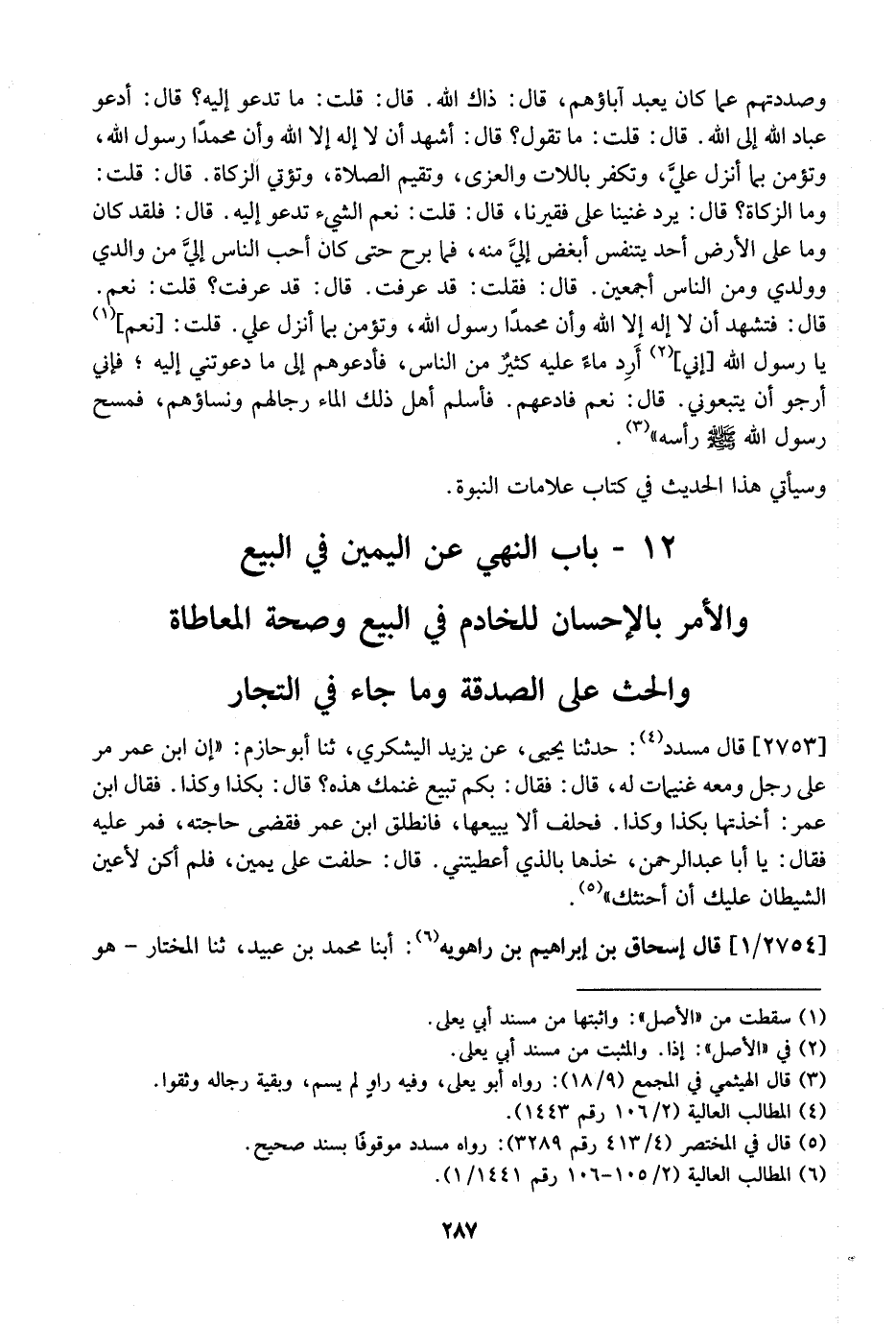 2753 - قال مسدد: حدثنا يَحْيَى، عَنْ يَزِيدَ الْيَشْكُرِيِّ، ثنا أَبُو حَازِمٍ: "إن ابن عمر مَرَّ عَلَى رَجُلٍ وَمَعَهُ غُنَيْمَاتٌ لَهُ، قَالَ: فَقَالَ: بِكَمْ تَبِيعُ غَنَمَكَ هَذِهِ؟ قَالَ: بِكَذَا وَكَذَا. فَقَالَ ابْنُ عُمَرَ: أَخَذْتُهَا بِكَذَا وَكَذَا. فحلف ألا يَبِيعَهَا، فَانْطَلَقَ ابْنُ عُمَرُ فَقَضَى حَاجَتَهُ، فَمَرَّ عَلَيْهِ فَقَالَ: يَا أَبَا عَبْدِ الرَّحْمَنِ، خُذْهَا بِالَّذِي أَعْطَيْتَنِي. قَالَ: حَلَفْتُ عَلَى يَمِينٍ، فَلَمْ أكن لأعين الشيطان عليك أن أحنثك ".