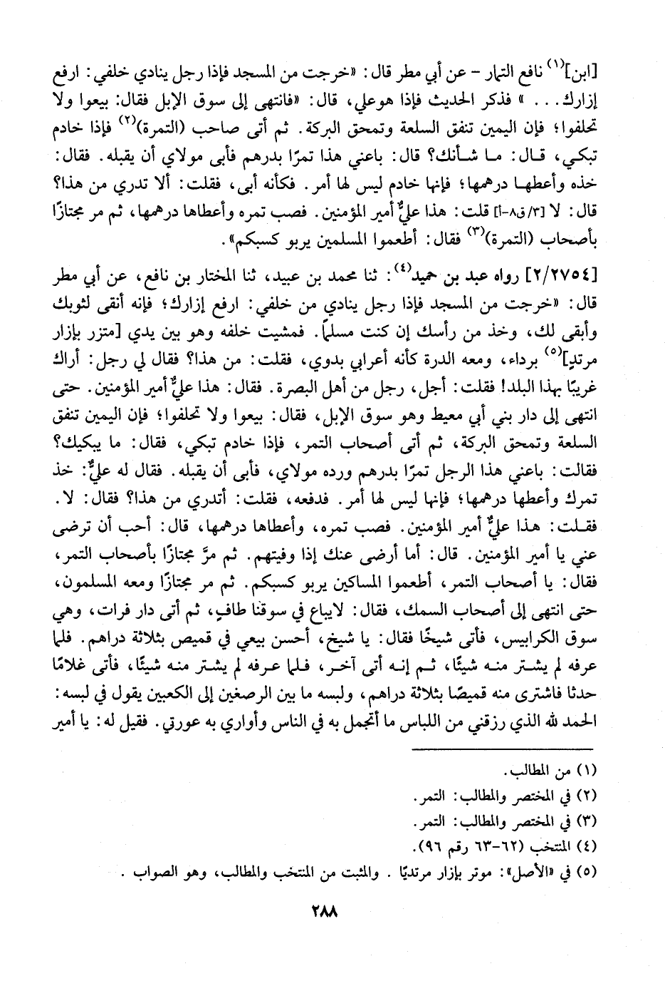 2754 / 2 - رَوَاهُ عَبْدُ بْنُ حُمَيْدٍ: ثَنَا مُحَمَّدُ بْنُ عُبَيْدٍ، ثَنَا الْمُخْتَارُ بْنُ نَافِعٍ، عَنْ أَبِي مَطَرٍ قَالَ: "خَرَجْتُ مِنَ الْمَسْجِدِ فَإِذَا رَجُلٌ يُنَادِي مِنْ خَلْفِي: ارْفَعْ إِزَارَكَ؛ فَإِنَّهُ أَنْقَى لِثَوْبِكَ وَأَبْقَى لَكَ، وَخُذْ مِنْ رَأْسِكَ إِنْ كُنْتَ مُسْلِمًا. فَمَشَيْتُ خَلْفَهُ وَهُوَ بَيْنَ يَدَيَّ متزر بإزار مرتدٍ بِرِدَاءٍ، وَمَعَهُ الدُّرَّةَ كَأَنَّهُ أَعْرَابِيٌّ بَدَوِيٌّ، فَقُلْتُ: مَنْ هَذَا؟ فَقَالَ لِي رَجُلٌ: أَرَاكَ غَرِيبًا بِهَذا الْبَلَدِ! فَقُلْتُ: أَجَلْ، رَجُلٌ مِنْ أَهْلِ الْبَصْرَةِ. فَقَالَ: هَذَا عَلِيٌّ أَمِيرُ الْمُؤْمِنِينَ. حَتَّى انْتَهَى إِلَى دَارِ بَنِي أَبِي مُعَيْطٍ وَهُوَ سوق الإبل، فقال: بيعوا ولا تحلفوا؛ فإن الْيَمِينَ تُنْفِقُ السِّلْعَةَ وَتَمْحَقُ الْبَرَكَةَ، ثُمَّ أَتَى أَصْحَابَ التَّمْرِ، فَإِذَا خَادِمٌ تَبْكِي، فَقَالَ: مَا يُبْكِيكِ؟ فَقَالَتْ: بَاعَنِي هَذَا الرَّجُلُ تَمْرًا بِدِرْهَمٍ ورده مَوْلَايَ، فَأَبَى أَنْ يَقْبَلَهُ. فَقَالَ لَهُ عَلِيٌّ: خُذْ تَمْرَكَ وَأَعْطِهَا دِرْهَمَهًا، فَإِنَّهَا لَيْسَ لَهَا أَمْرٌ. فَدَفَعَهُ، فَقُلْتُ: أَتَدْرِي مَنْ هَذَا؟ فَقَالَ: لا. فقلت: هذا عليّ أمير المؤمنين. فصب تَمْرَهُ، وَأَعْطَاهَا دِرْهَمَهًا، قَالَ: أُحِبُّ أَنْ تَرْضَى عَنِّي يَا أَمِيرَ الْمُؤْمِنِينَ. قَالَ: أَمَا أَرْضَى عنك إذا وفيتهم. ثُمَّ مرَّ مُجْتَازًا بِأَصْحَابِ التَّمْرِ، فَقَالَ: يَا أَصْحَابَ التَّمْرِ، أَطْعِمُوا الْمَسَاكِينَ يَرْبُو كَسْبُكُمْ. ثُمَّ مَرَّ مُجْتَازًا وَمَعَهُ الْمُسْلِمُونَ، حَتَّى انْتَهَى إِلَى أصحاب السمك، فقال: لايباع في سوقنا طافٍ، ثُمَّ أَتَى دَارَ فُرَاتَ، وَهِيَ سُوقُ الْكَرَابِيسِ، فَأَتَى شَيْخًا فَقَالَ: يَا شَيْخُ، أَحْسِنْ بَيْعِي فِي قَمِيصٍ بِثَلَاثَةِ دَرَاهِمَ. فَلَمَّا عَرَفَهُ لَمْ يشتر منه شيئًا، ثُمَّ إِنَّهُ أَتَى آخَرَ، فَلَمَّا عَرَفَهُ لَمْ يَشْتَرِ مِنْهُ شَيْئًا، فَأَتَى غُلَامًا حَدَثًا فَاشْتَرَى مِنْهُ قَمِيصًا بِثَلَاثَةِ دَرَاهِمَ، ولبسه مابين الرصغين إِلَى الْكَعْبَيْنِ يَقُولُ فِي لُبْسِهِ: الْحَمْدُ للِّهِ الَّذِي رَزَقَنِي مِنَ اللِّبَاسِ مَا أَتَجَمَّلُ بِهِ فِي النَّاسِ وَأُوَارِي بِهِ عَوْرَتِي. فَقِيلَ لَهُ: يا أمير