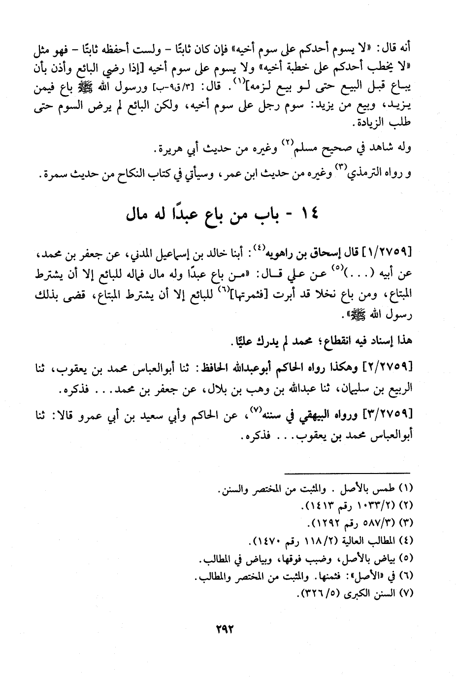 2759 / 1 - قَالَ إِسْحَاقُ بْنُ راهويه: أبنا خَالِدُ بْنُ إِسْمَاعِيلَ الْمَدَنِيُّ، عَنْ جَعْفَرِ بْنِ مُحَمَّدٍ، عَنْ أَبِيهِ ( ... ) عَنْ عَلِيٍّ قَالَ: "مَنْ بَاعَ عَبْدًا وَلَهُ مَالٌ فَمَالُهُ لِلْبَائِعِ إِلَّا أَنْ يَشْتَرِطَ الْمُبْتَاعُ، وَمَنْ بَاعَ نَخْلًا قَدْ أُبِّرَتْ فَثَمَرَتُهَا لِلْبَائِعِ إِلَّا أَنْ يَشْتَرِطَ الْمُبْتَاعُ، قَضَى بِذَلِكَ رَسُولُ اللَّهِ - صَلَّى اللَّهُ عَلَيْهِ وَسَلَّمَ - ".