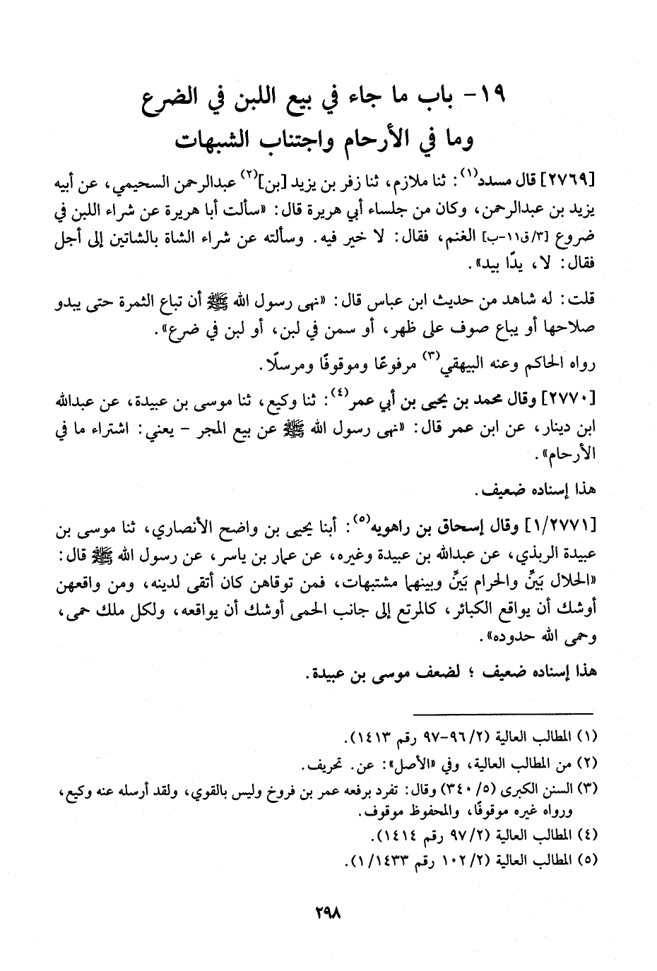 2769 - قَالَ مُسَدَّدٌ: ثنا مُلَازِمٌ، ثنا زُفَرُ بْنُ يَزِيدَ بن عَبْدِ الرَّحْمَنِ السُحَيْمِيِّ، عَنْ أَبِيهِ يَزِيدَ بْنِ عَبْدِ الرَّحْمَنِ، وَكَانَ مِنْ جُلَسَاءِ أَبِي هُرَيْرَةَ قَالَ: "سَأَلْتُ أَبَا هُرَيْرَةَ عَنْ شِرَاءِ اللَّبَنِ فِي ضُرُوعِ الْغَنَمِ، فَقَالَ: لَا خَيْرَ فِيهِ. وَسَأَلْتُهُ عَنْ شِرَاءِ الشَّاةِ بِالشَّاتَيْنِ إِلَى أَجَلٍ فيقال: لَا، يَدًا بِيَدٍ".