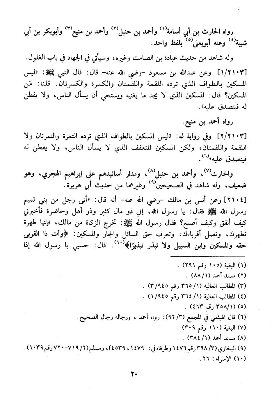 2103 / 2 - وَفِي رِوَايَةٍ لَهُ: "لَيْسَ الْمِسْكِينُ بِالطَّوَّافِ الَّذِي تَرُدُّهُ التَّمْرَةُ وَالتَّمْرَتَانِ وَلَا اللُّقْمَةُ وَاللُّقْمَتَانِ، ولكن المسكين المتعفف الَّذِي لَا يَسْأَلُ النَّاسَ، وَلَا يُفْطَنُ لَهُ فَيُتَصَدَّقَ عَلَيْهِ ". وَالْحَارِثُ، وَأَحْمَدُ بْنُ حَنْبَلٍ، وَمَدَارُ أَسَانِيدِهِمْ عَلَى إِبْرَاهِيمَ الْهَجْرِيِّ، وَهُوَ ضَعِيفٌ، وَلَهُ شَاهِدٌ فِي الصَّحِيحَيْنِ وَغَيْرِهِمَا مِنْ حَدِيثِ أَبِي هُرَيْرَةَ.