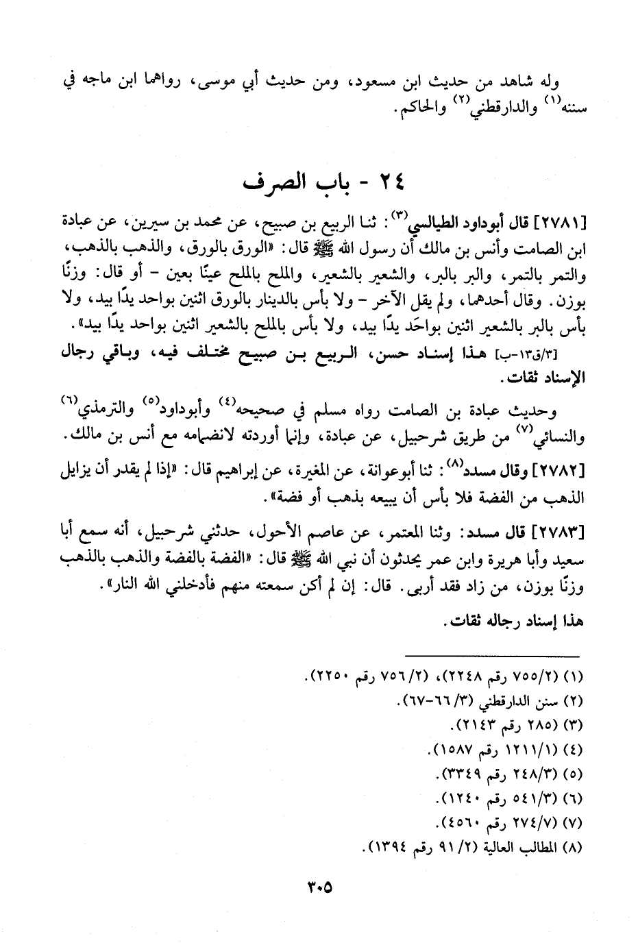 2781 - قَالَ أَبُو دَاوُدَ الطَّيَالِسِيُّ: ثنا الرَّبِيعُ بْنُ صُبَيْحٍ، عَنْ مُحَمَّدِ بْنِ سِيرِينَ، عَنْ عُبَادَةَ بْنِ الصَّامِتِ وَأَنَسِ بْنِ مَالِكٍ أَنّ رَسُولَ اللَّهِ - صَلَّى اللَّهُ عليه وسلم - قال: "الْوَرِقُ بِالْوَرِقِ، وَالذَّهَبُ بِالذَّهَبِ، وَالتَّمْرُ بِالتَّمْرِ، وَالْبُرُّ بِالْبُرِّ، وَالشَّعِيرُ بِالشَّعِيرِ، وَالْمِلْحُ بِالْمِلْحِ عَيْنًا بِعَيْنٍ- أَوْ قَالَ: وَزْنًا بِوَزْنٍ. وَقَالَ أَحَدَهُمَا، وَلَمْ يَقُلِ الْآخَرَ- وَلَا بِأْسَ بِالدِّينَارِ بِالْوَرِقِ اثْنَيْنِ بِوَاحِدٍ يَدًا بِيَدٍ، وَلَا بَأْسَ بِالْبُرِّ بِالشَّعِيرِ اثْنَيْنِ بواحَد يَدًا بِيَدٍ، وَلَا بَأْسَ بِالْمِلْحِ بِالشَّعِيرِ اثْنَيْنِ بِوَاحِدٍ يَدًا بِيَدٍ". هَذَا إِسْنَادٌ حسن، الربيع بن صبيح مختلف فيه، وباقي رجال الإسناد ثقات.