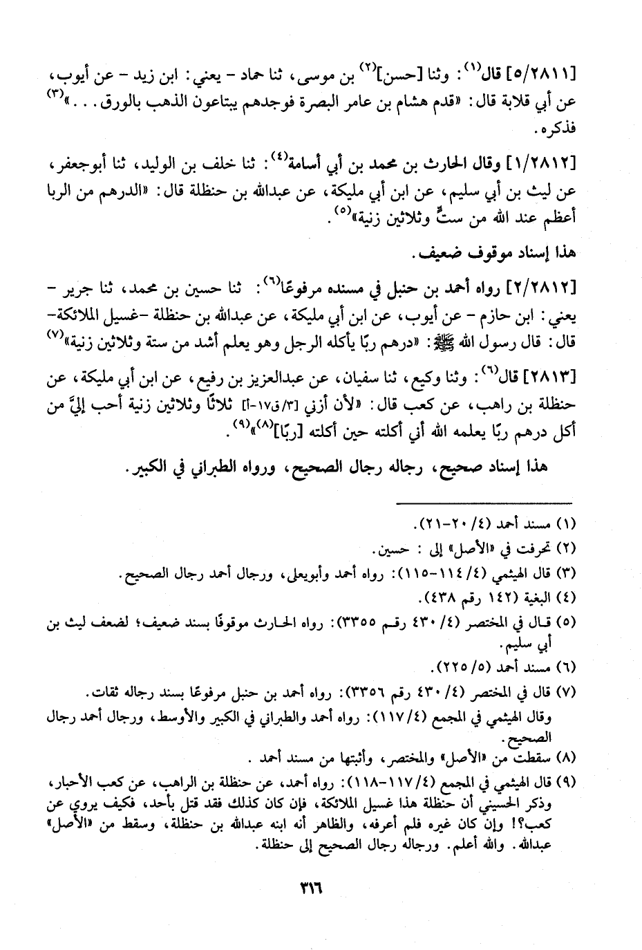 2812 / 2 - رَوَاهُ أَحْمَدُ بْنُ حَنْبَلٍ فِي مُسْنَدِهِ مَرْفُوعًا: ثنا حسين بن محمد، ثنا جرير- يعني: ابن حَازِمٍ- عَنْ أَيُّوبَ، عَنِ ابْنِ أَبِي مَلِيكَةَ، عَنْ عَبْدِ اللَّهِ بْنِ حَنْظَلَةَ- غَسِيلِ الْمَلَائِكَةَ- قَالَ: قَالَ رَسُولُ اللَّهِ - صَلَّى اللَّهُ عَلَيْهِ وَسَلَّمَ -: "دِرْهَمُ رِبًا يَأْكُلُهُ الرَّجُلُ وَهُوَ يَعْلَمُ أَشَدُّ مِنْ سِتَّةٍ وَثَلَاثِينَ زَنْيَةً"