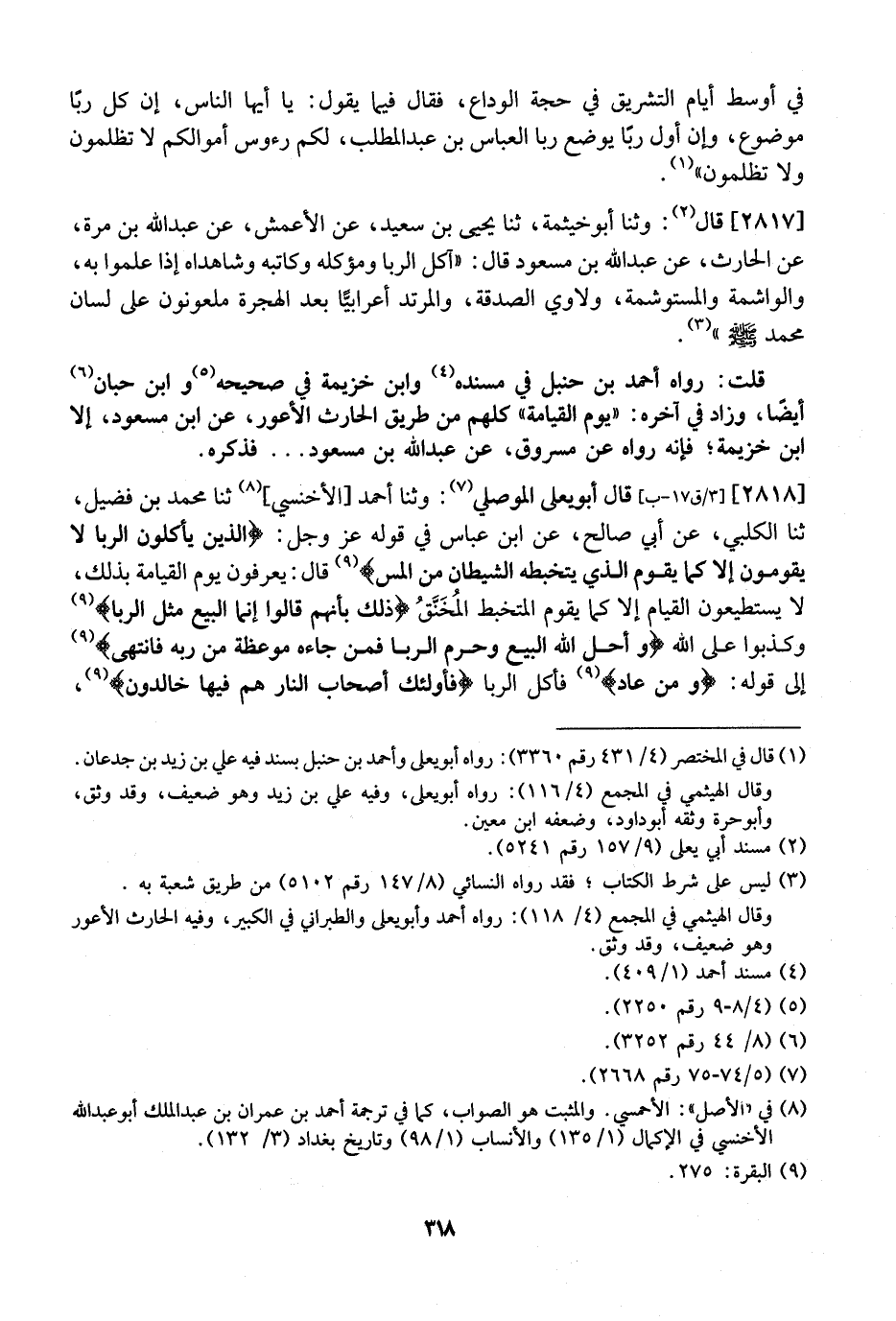 2818 - قَالَ أَبُو يَعْلَى الْمَوْصِلِيُّ: وثنا أَحْمَدُ الْأَخْنَسِيُّ، ثَنَا مُحَمَّدُ بْنُ فُضَيْلٍ، ثَنَا الْكَلْبِيُّ، عَنْ أَبِي صَالِحٍ، عَنِ ابْنِ عَبَّاسٍ فِي قَوْلِهِ عَزَّ وَجَلَّ: ? الَّذِينَ يَأْكُلُونَ الرِّبَا لا يَقُومُونَ إِلا كَمَا يَقُومُ الَّذِي يَتَخَبَّطُهُ الشَّيْطَانُ مِنَ المس ? قَالَ: يُعْرَفُونَ يَوْمَ الْقِيَامَةِ بِذَلِكَ، لَا يَسْتَطِيعُونَ القيام إلا كما يقوم المتخبط المُخَنَّقُ ? ذَلِكَ بِأَنَّهُمْ قَالُوا إِنَّمَا الْبَيْعُ مِثْلُ الرِّبَا ? وَكَذَبُوا عَلَى اللَّهِ ? وَأَحَلَّ اللَّهُ الْبَيْعَ وَحَرَّمَ الرِّبَا فَمَنْ جَاءَهُ مَوْعِظَةٌ مِنْ رَبِّهِ فَانْتَهَى ? إلى قوله: ? ومن عاد ? فَأَكَلَ الرِّبَا ? فَأُولَئِكَ أَصْحَابُ النَّارِ هُمْ فِيهَا خَالِدُونَ ?