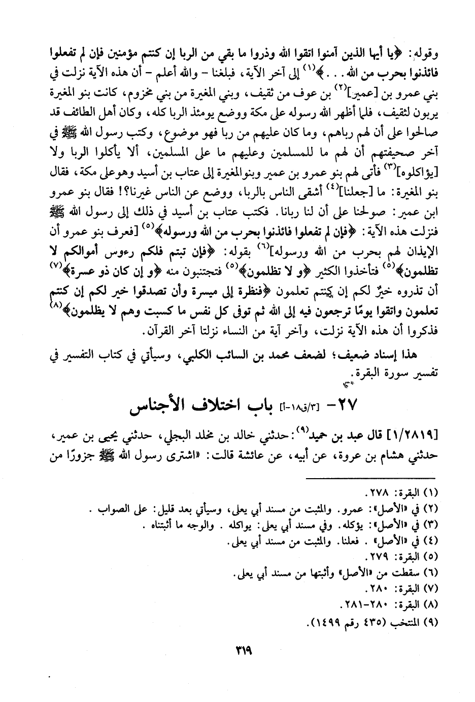 وقوله: ? يا أيها الَّذِينَ آمَنُوا اتَّقُوا اللَّهَ وَذَرُوا مَا بَقِيَ مِنَ الرِّبَا إِنْ كُنْتُمْ مُؤْمِنِينَ فَإِنْ لَمْ تفعلوا فائذنوا بحرب من الله ... ? إِلَى آخِرِ الْآيَةِ، فَبَلَغَنَا- وَاللَّهُ أَعْلَمُ- أَنَّ هَذِهِ الْآيَةَ نَزَلَتْ فِي بَنِي عَمْرِو بْنِ عُمَيْرِ بْنِ عَوْفٍ مِنْ ثَقِيفَ، وَبَنِي الْمُغَيْرَةِ مِنْ بَنِي مخزوم، كانت بنو المغيرة يربون لثقيف، فلما أظهر الله رسوله عَلَى مَكَّةَ وَوَضَعَ يَوْمَئِذٍ الرِّبَا كُلَّهُ، وَكَانَ أَهْلُ الطَّائِفِ قَدْ صَالَحُوا عَلَى أَنَّ لَهُمْ رِبَاهُمْ، وَمَا كَانَ عَلَيْهِمْ مِنْ رِبًا فَهُوَ مَوْضُوعٌ، وَكَتَبَ رَسُولُ اللَّهِ - صَلَّى اللَّهُ عَلَيْهِ وَسَلَّمَ - فِي آخِرِ صَحِيفَتِهِمْ أَنَّ لَهُمْ مَا للمسلمين وعليهم ما على المسلمين، ألا يأكلوا الربا ولا يؤاكلوه فأتى لهم بنو عمرو بن عمير وبنوالمغيرة إلى عتاب بن أسيد وهوعلى مَكَّةَ، فَقَالَ بَنُو الْمُغِيرَةِ: مَا جَعَلَنَا أَشَقِيَ النَّاسُ بِالرِّبَا، وَوَضَعَ عَنِ النَّاسِ غَيْرِنَا؟! فَقَالَ بَنُو عَمْرِو بْنِ عُمَيْرٍ: صُولِحْنَا عَلَى أَنَّ لَنَا رِبَانَا. فَكَتَبَ عَتَّابُ بْنُ أُسَيْدٍ فِي ذَلِكَ إِلَى رَسُولِ اللَّهِ - صَلَّى اللَّهُ عَلَيْهِ وَسَلَّمَ - فَنَزَلَتْ هَذِهِ الْآيَةُ: ? فَإِنْ لَمْ تَفْعَلُوا فائذنوا بحرب من الله ورسوله ? فعرف بنو عمرو أن الإيذان لهم بحرب من الله ورسوله بقوله: ? فإن تبتم فلكم رءوس أموالكم لا تظلمون ? فتأخذوا الكثير ? ولا تظلمون ? فتجتنبون منه ? وإن كان ذو عسرة ? أَنْ تَذَرُوهُ خيرٌ لَكُمْ إِنْ كُنْتُمْ تَعْلَمُونَ ? فَنَظِرَةٌ إِلَى مَيْسَرَةٍ وَأَنْ تَصَدَّقُوا خَيْرٌ لَكُمْ إِنْ كُنْتُمْ تَعْلَمُونَ وَاتَّقُوا يَوْمًا تُرْجَعُونَ فِيهِ إِلَى اللَّهِ ثُمَّ تُوَفَّى كُلُّ نَفْسٍ مَا كَسَبَتْ وَهُمْ لا يظلمون ? فذكروا أن هذه الاآية نزلت، وآخر آية من النساء نزلتا آخِرَ الْقُرْآنَ. هَذَا إِسْنَادٌ ضَعِيفٌ، لِضَعْفِ مُحَمَّدِ بْنِ السَّائِبِ الْكَلْبِيِّ، وَسَيَأْتِي فِي كِتَابِ التَّفْسِيرِ فِي تَفْسِيرِ سُورَةِ الْبَقَرَةِ.