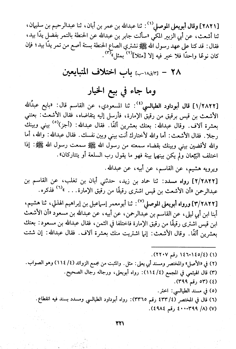 2822 / 3 - وَرَوَاهُ أَبُو يَعْلَى الْمَوْصِلِيُّ: ثَنَا أَبُو مَعْمَرٍ إِسْمَاعِيلُ بْنُ إِبْرَاهِيمَ الهذلي، ثنا هشيم، أبنا ابْنِ أَبِي لَيْلَى، عَنِ الْقَاسِمِ بْنِ عَبْدِ الرَّحْمَنِ، عَنْ أَبِيهِ، عَنْ عَبْدِ اللَّهِ بْنِ مَسْعُودٍ "أَنَّ الْأَشْعَثَ بْنَ قَيْسٍ اشْتَرَى رَقِيقًا مِنْ رَقِيقِ الْإِمَارَةِ فَاخْتَلَفَا فِي الثَّمَنِ، فَقَالَ عَبْدُ اللَّهِ بْنُ مَسْعُودٍ: بِعْتُكَ بِعِشْرِينَ أَلْفًا. وَقَالَ الْأَشْعَثُ: إِنَّمَا اشْتَرَيْتُ مِنْكَ بِعَشْرَةِ آلَافٍ. فَقَالَ عَبْدُ الله: إن شئت
