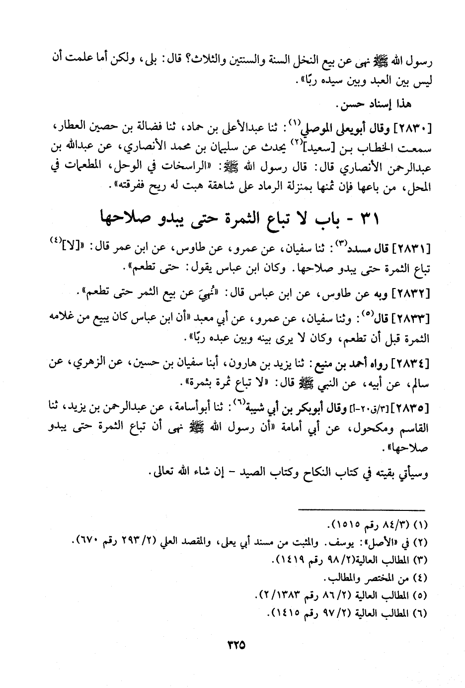 2831 - قَالَ مُسَدَّدٌ: ثنا سُفْيَانُ، عَنْ عَمْرٍو، عَنْ طَاوُسٍ، عَنِ ابْنِ عُمَرَ قَالَ: "لَا تُبَاعُ الثَّمَرَةُ حَتَّى يَبْدُوَ صَلَاحُهَا. وَكَانَ ابْنُ عَبَّاسٍ يَقُولُ: حَتَّى تُطَْعَمَ ".