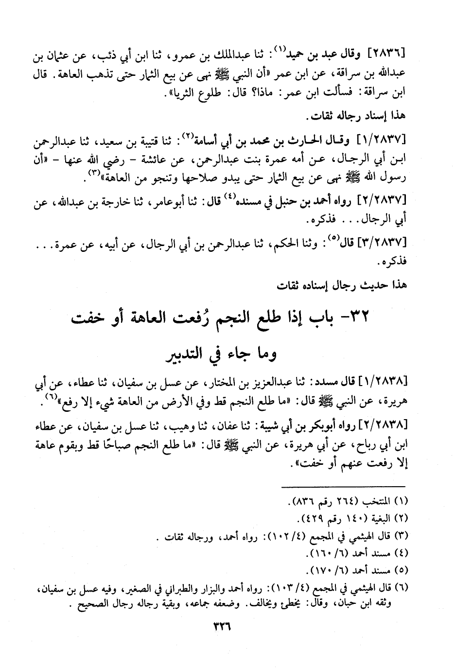 2836 - وَقَالَ عَبْدُ بْنُ حُمَيْدٍ: ثَنَا عَبْدُ الْمَلِكِ بْنُ عَمْرٍو، ثنا ابْنُ أَبِي ذِئْبٍ، عَنْ عُثْمَانَ بْنِ عَبْدِ اللَّهِ بْنِ سُرَاقَةَ، عَنِ ابْنِ عُمَرَ "أَنَّ النَّبِيَّ - صَلَّى اللَّهُ عَلَيْهِ وَسَلَّمَ - نَهَى عَنْ بَيْعِ الثِّمَارِ حَتَّى تَذْهَبَ الْعَاهَةُ. قَالَ ابْنُ سُرَاقَةَ: فَسَأَلْتُ ابْنَ عُمَرَ: مَاذَا؟ قَالَ: طُلُوعُ الثُّرَيَّا". هَذَا إِسْنَادٌ رِجَالُهُ ثِقَاتٌ.