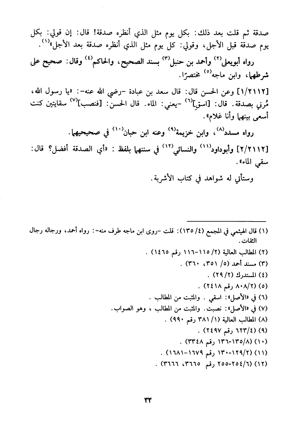 2112 / 1 - وَعَنِ الْحَسَنِ قَالَ: قَالَ سَعْدُ بْنُ عُبَادَةَ- رَضِيَ اللَّهُ عَنْهُ-: "يَا رَسُولَ اللَّهِ، مُرني بِصَدَقَةٍ. قال: اسقِ - يعني: الماء. قال الحسن: فنصب سقايتين كنت أسعى بينهما وأنا غُلَامٌ ". رَوَاهُ مُسَدَّدٌ، وَابْنُ خُزَيْمَةَ وَعَنْهُ ابْنُ حِبَّانَ فِي صَحِيحَيْهِمَا.