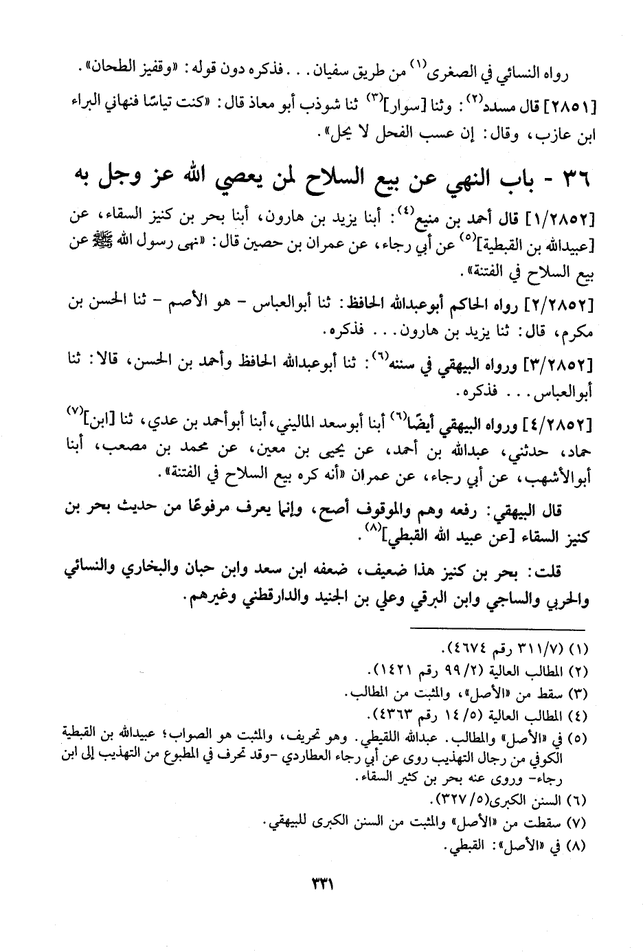 2852 / 1 - قال أحمد بن منيع: أبنا يزيد بن هارون، أبنا بحر بن كنيز السقاء، عن عبيد اللَّهِ بْنِ الْقِبْطِيَّةِ، عَنْ أَبِي رَجَاءٍ، عَنْ عِمْرَانَ بْنِ حُصَيْنٍ قَالَ: "نَهَى رَسُولُ اللَّهِ - صَلَّى اللَّهُ عَلَيْهِ وَسَلَّمَ - عَنْ بَيْعِ السِّلَاحِ فِي الْفِتْنَةِ".