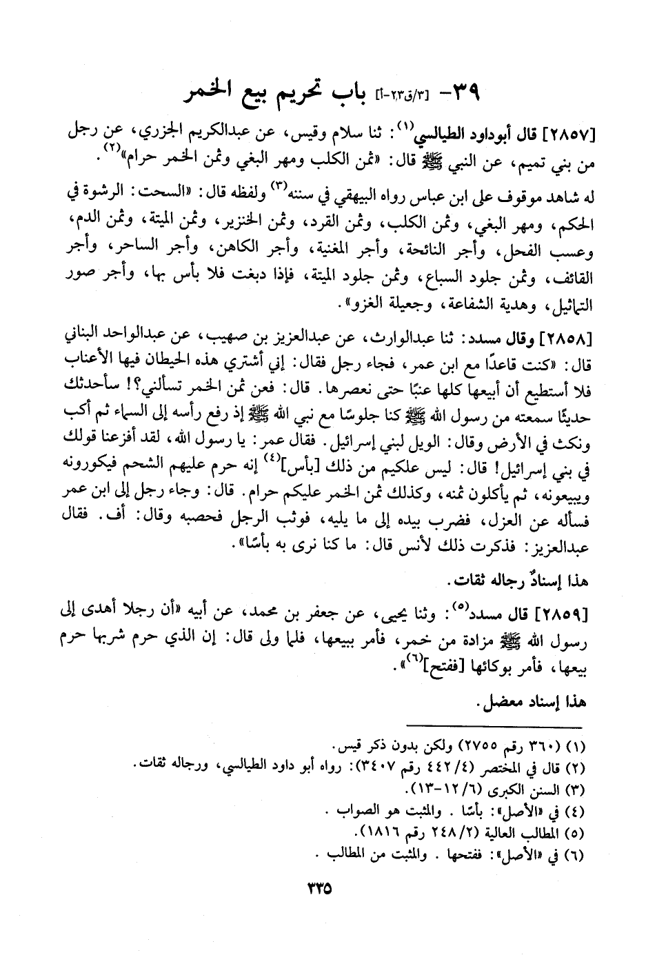 2858 - وَقَالَ مُسَدَّدٌ: ثَنَا عَبْدُ الْوَارِثِ، عَنْ عَبْدِ الْعَزِيزِ بْنِ صُهَيْبٍ، عَنْ عَبْدِ الْوَاحِدِ الْبَنَانِيِّ قَالَ: "كُنْتُ قَاعِدًا مَعَ ابْنِ عُمَرَ، فَجَاءَ رَجُلٌ فَقَالَ: إني أَشْتَرِي هَذِهِ الْحِيطَانَ فِيهَا الْأَعْنَابُ فَلَا أَسْتَطِيعُ أَنْ أَبِيعَهَا كُلَّهَا عِنَبًا حَتَّى نَعْصِرَهَا. قَالَ: فَعَنْ ثَمَنِ الْخَمْرِ تَسْأَلُنِي؟! سَأُحَدِّثُكَ حَدِيثًا سَمِعْتُهُ مِنْ رَسُولِ اللَّهِ - صَلَّى اللَّهُ عَلَيْهِ وَسَلَّمَ - كُنَّا جُلُوسًا مَعَ نَبِيِّ اللَّهِ - صَلَّى اللَّهُ عَلَيْهِ وَسَلَّمَ - إِذْ رَفَعَ رَأْسَهُ إِلَى السَّمَاءِ ثُمَّ أَكَبَّ وَنَكَثَ فِي الْأَرْضِ وَقَالَ: الْوَيْلُ لِبَنِي إِسْرَائِيلَ. فَقَالَ عُمَرُ: يَا رَسُولَ اللَّهِ، لَقَدْ أَفْزَعَنَا قولك في بني إسرائيل! قال: ليس علكيم مِنْ ذَلِكَ بَأْسٌ إِنَّهُ حُرِّمَ عَلَيْهِمُ الشَّحْمُ فَيُكَوِّرُونَهُ وَيَبِيعُونَهُ، ثُمَّ يَأْكُلُونَ ثَمَنَهُ، وَكَذَلِكَ ثَمَنُ الْخَمْرِ عَلَيْكُمْ حَرَامٌ. قَالَ: وَجَاءَ رَجُلٌ إِلَى ابْنِ عُمَرَ فَسَأَلَهُ عَنِ الْعَزْلِ، فَضَرَبَ بِيَدِهِ إِلَى مَا يَلِيهِ، فَوَثَبَ الرَّجُلُ فَحَصَبَهُ وَقَالَ: أُفٍّ. فَقَالَ عَبْدُ الْعَزِيزِ: فَذَكَرْتُ ذَلِكَ لِأَنَسٍ قَالَ: مَا كُنَّا نَرَى بِهِ بَأْسًا". هَذَا إسنادٌ رِجَالُهُ ثِقَاتٌ.