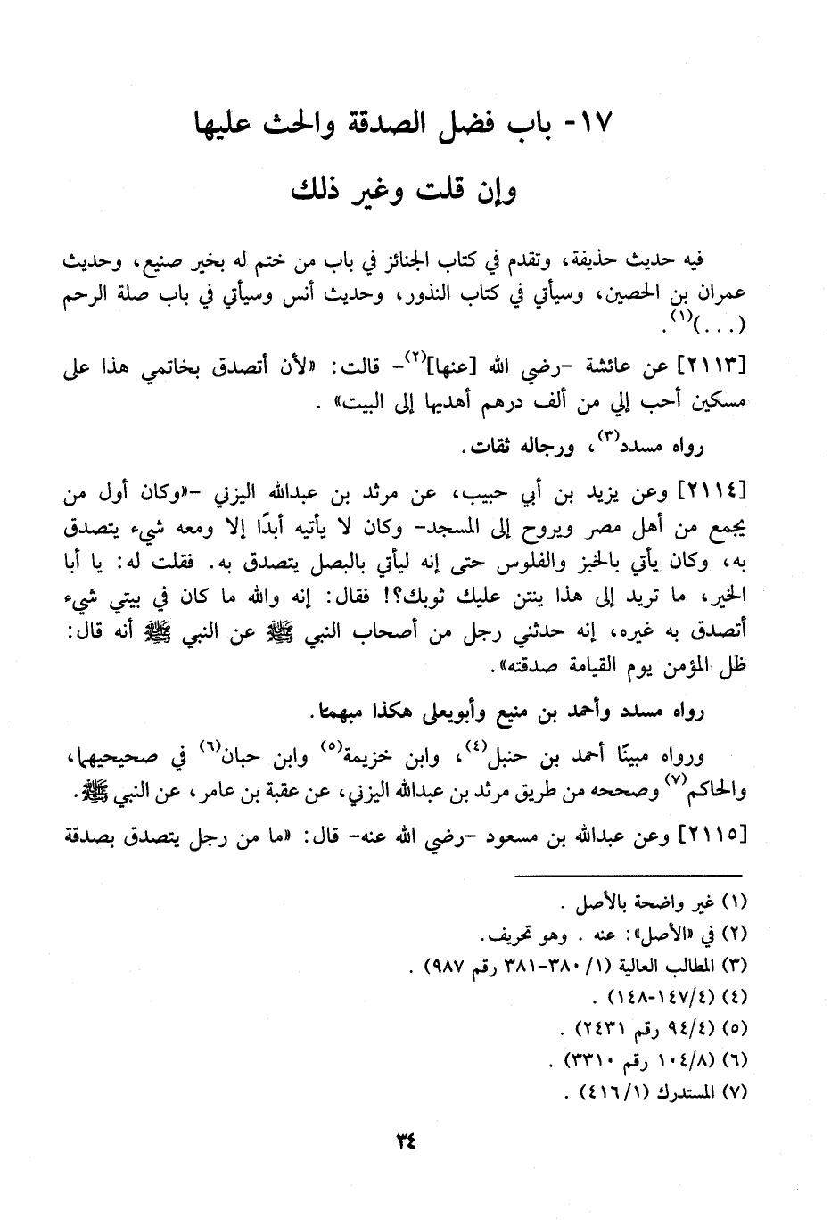 2114 - وَعَنْ يَزِيدَ بْنِ أَبِي حَبِيبٍ، عَنْ مَرْثَدِ بْنِ عَبْدِ اللَّهِ الْيَزْنِيِّ- "وَكَانَ أَوَّلَ مَنْ يَجْمَعُ مِنْ أَهْلِ مِصْرَ وَيَرُوحُ إِلَى الْمَسْجِدِ- وَكَانَ لَا يَأْتِيهِ أَبَدًا إِلَّا وَمَعَهُ شَيْءٌ يَتَصَدَّقُ بِهِ، وَكَانَ يَأْتِي بِالْخُبْزِ وَالْفُلُوسِ حَتَّى إِنَّهُ لَيَأْتِي بِالْبَصَلِ يَتَصَدَّقُ بِهِ. فَقُلْتُ لَهُ: يَا أَبَا الْخَيْرِ، مَا تُريِدُ إِلَى هَذَا يُنْتِنُ عَلَيْكَ ثَوْبَكَ؟! فَقَالَ: إِنَّهُ وَاللَّهِ مَا كَانَ فِي بَيْتِي شَيْءٌ أَتَصَدَّقُ بِهِ غَيْرُهُ، إِنَّهُ حَدَّثَنِي رَجُلٍ مِنْ أَصْحَابِ النَّبِيِّ - صَلَّى اللَّهُ عَلَيْهِ وَسَلَّمَ - عَنِ النَّبِيِّ - صَلَّى اللَّهُ عَلَيْهِ وَسَلَّمَ - أَنَّهُ قَالَ: ظِلُّ الْمُؤْمِنِ يَوْمَ الْقِيَامَةِ صَدَقَتُهُ ". رَوَاهُ مُسَدَّدٌ وَأَحْمَدُ بن منيع وأبو يعلى هكذا مبهمًا. وَرَوَاهُ مُبَيَّنًا أَحْمَدُ بْنُ حَنْبَلٍ، وَابْنُ خُزَيْمَةَ وَابْنُ حِبَّانَ فِي صَحِيحَيْهِمَا، وَالْحَاكِمُ وَصَحَّحَهُ مِنْ طَرِيقِ مَرْثَدَ بْنِ عَبْدِ اللَّهِ الْيَزْنِيِّ، عَنْ عُقْبَةَ بْنِ عَامِرٍ، عَنِ النَّبِيَّ - صَلَّى اللَّهُ عَلَيْهِ وَسَلَّمَ -.