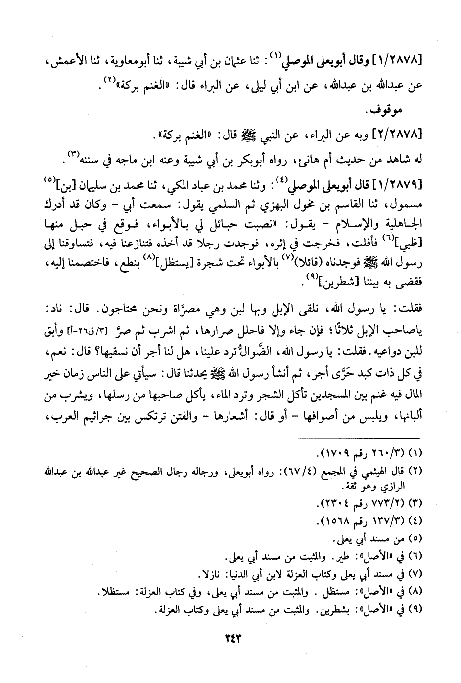 2879 / 1 - قَالَ أَبُو يَعْلَى الْمَوْصِلِيُّ: وثنا مُحَمَّدُ بْنُ عَبَّادٍ الْمَكِّيُّ، ثَنَا مُحَمَّدُ بْنُ سُلَيْمَانَ بْنِ مَسَمْوُلٌ، ثنا الْقَاسِمُ بْنُ مُخَوِّلٍ الْبَهْزِيُّ ثُمَّ السَّلَمِيُّ يَقُولُ: سَمِعْتُ أَبِي- وَكَانَ قَدْ أَدْرَكَ الْجَاهِلِيَّةَ وَالْإِسْلَامَ- يَقُولُ: "نَصَبْتُ حَبَائِلَ لِي بِالْأَبْوَاءِ، فَوَقَعَ فِي حَبْلٍ مِنْهَا ظَبْيٌ فَأَفْلَتَ، فَخَرَجْتُ فِي أَثَرِهِ، فَوَجَدْتُ رَجُلًا قَدْ أَخَذَهُ فَتَنَازَعْنَا فِيهِ، فَتَسَاوَقْنَا إِلَى رَسُولِ اللَّهِ - صَلَّى اللَّهُ عَلَيْهِ وَسَلَّمَ - فَوَجَدْنَاهُ (قَائِلًا) بِالْأَبْوَاءِ تَحْتَ شَجَرَةٍ يَسْتَظِلُّ بِنَطْعٍ، فَاخْتَصَمْنَا إِلَيْهِ، فَقَضَى بِهِ بَيْنَنَا شَطْرَيْنِ. فَقُلْتُ: يَا رَسُولَ اللَّهِ، نَلْقَى الْإِبِلَ وَبِهَا لَبَنٌ وَهِيَ مصرَّاة وَنَحْنُ مُحْتَاجُونَ. قَالَ: نَادِ: ياصاحب الْإِبِلِ ثَلَاثًا، فَإِنْ جَاءَ وَإِلَّا فَأَحْلُلْ صِرَارَهَا، ثُمَّ اشْرَبْ ثُمَّ صرَّ وَأَبْقِ لِلَّبَنِ دَوَاعِيهِ. فَقُلْتُ: يَا رَسُولَ اللَّهِ، الضَّوال تَرِدُ عَلَيْنَا، هَلْ لَنَا أَجْرٌ أَنْ نَسْقِيَهَا؟ قَالَ: نَعَمْ، فِي كُلِّ ذَاتِ كَبِدٍ حَرَّى أَجْرٌ، ثُمَّ أَنْشَأَ رسول الله يُحَدِّثُنَا قَالَ: سَيَأْتِي عَلَى النَّاسِ زَمَانٌ خَيْرُ الْمَالِ فِيهِ غَنَمٌ بَيْنَ الْمَسْجِدَيْنِ تَأْكُلُ الشَّجَرَ وَتَرِدُ الْمَاءَ، يَأْكُلُ صَاحِبُهَا مِنْ رَسَلِهَا، وَيَشْرَبُ مِنْ أَلْبَانِهَا، وَيَلْبَسُ مِنْ أَصْوَافِهَا- أَوْ قَالَ: أَشْعَارِهَا- والفتن ترتكس بين جراثيم العرب،