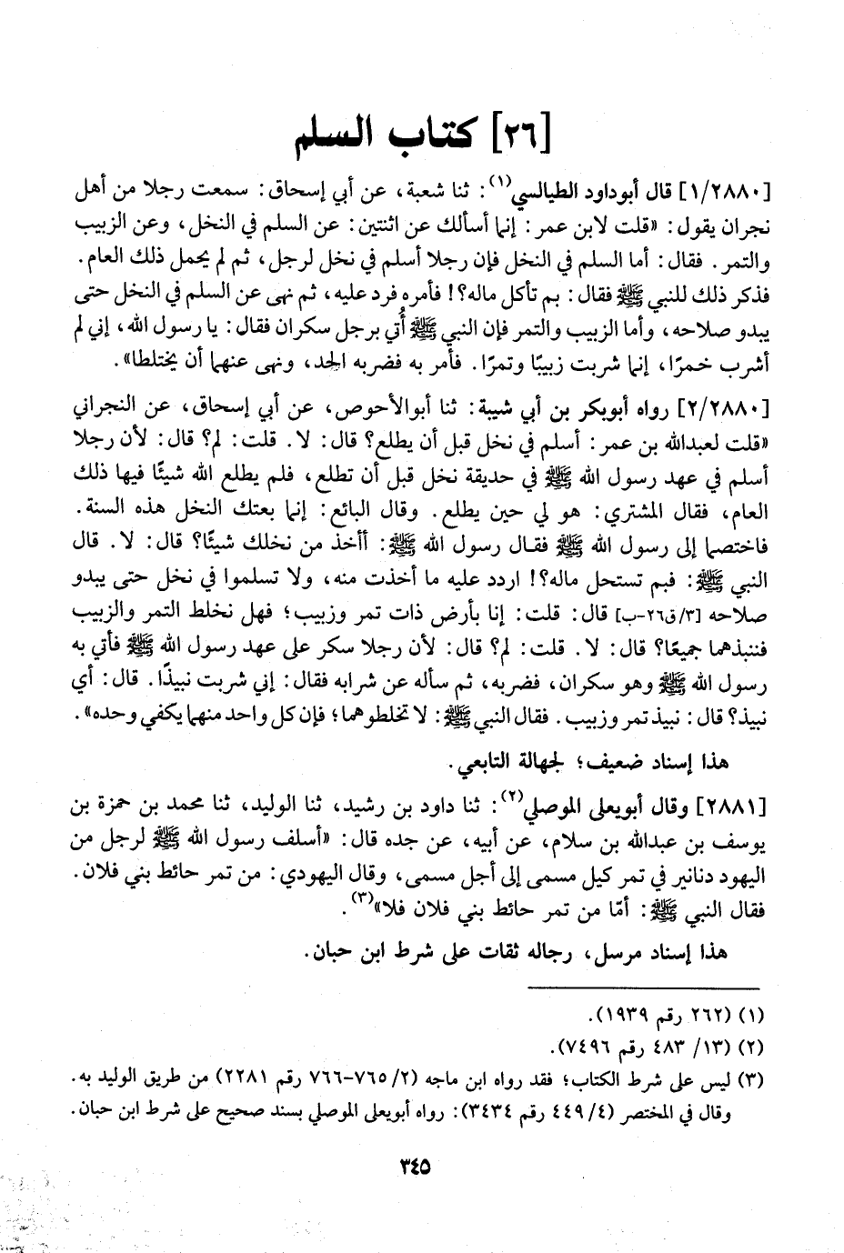 2880 / 2 - رَوَاهُ أَبُو بَكْرِ بْنُ أَبِي شَيْبَةَ: ثنا أبو الأحوص، عن أبي إِسْحَاقَ، عَنِ النَّجْرَانِيِّ "قُلْتُ لِعَبْدِ اللَّهِ بْنِ عُمَرَ: أُسْلِمُ فِي نَخْلٍ قَبْلَ أَنْ يَطْلُعَ؟ قَالَ: لَا. قُلْتُ: لِمَ؟ قَالَ: لِأَنَّ رَجُلًا أَسْلَمَ فِي عَهْدِ رَسُولِ اللَّهِ - صَلَّى اللَّهُ عَلَيْهِ وَسَلَّمَ - فِي حَدِيقَةِ نَخْلٍ قَبْلَ أَنْ تَطْلُعَ، فَلَمْ يُطْلِعِ اللَّهُ شَيْئًا فِيهَا ذَلِكَ الْعَامَ، فَقَالَ الْمُشْتَرِي: هُوَ لِي حِينَ يَطْلُعُ. وَقَالَ الْبَائِعُ: إِنَّمَا بِعْتُكَ النَّخْلَ هَذِهِ السَّنَةَ. فَاخْتَصَمَا إِلَى رَسُولِ اللَّهِ - صَلَّى اللَّهُ عَلَيْهِ وَسَلَّمَ - فَقَالَ رَسُولُ اللَّهِ - صَلَّى اللَّهُ عَلَيْهِ وَسَلَّمَ -: أأخذ مِنْ نَخْلِكَ شَيْئًا؟ قَالَ: لَا. قَالَ النَّبِيُّ - صَلَّى اللَّهُ عَلَيْهِ وسلم -: فبم تَسْتَحِلُّ مَالَهُ؟! ارْدُدْ عَلَيْهِ مَا أَخَذْتَ مِنْهُ، وَلَا تُسْلِمُوا فِي نَخْلٍ حَتَّى يَبْدُوَ صَلَاحُهُ قَالَ: قُلْتُ: إِنَّا بِأَرْضٍ ذَاتِ تَمْرٍ وَزَبِيبٍ؛ فَهَلْ نَخْلِطُ التَّمْرَ وَالزَّبِيبَ فَنَنَبِذُهُمَا جَمِيعًا؟ قَالَ: لَا. قُلْتُ: لِمَ؟ قَالَ: لِأَنَّ رَجُلًا سَكِرَ عَلَى عَهْدِ رَسُولِ اللَّهِ - صَلَّى اللَّهُ عَلَيْهِ وَسَلَّمَ - فَأَتَى بِهِ رَسُولُ اللَّهِ - صَلَّى اللَّهُ عَلَيْهِ وَسَلَّمَ - وَهُوَ سَكْرَانُ، فَضَرَبَهُ، ثُمَّ سَأَلَهُ عَنْ شَرَابِهِ فَقَالَ: إِنِّي شَرِبْتُ نَبِيذًا. قَالَ: أي نبيذ؟ قَالَ: نَبِيذُ تَمْرٍ وَزَبِيبٍ. فَقَالَ النَّبِيُّ - صَلَّى اللَّهُ عَلَيْهِ وَسَلَّمَ -: لَا تَخْلِطُوهُمَا، فَإِنَّ كُلَّ وَاحِدٍ مِنْهُمَا يَكْفِي وَحْدَهُ ". هَذَا إِسْنَادٌ ضَعِيفٌ، لِجَهَالَةِ التَّابِعِيِّ.