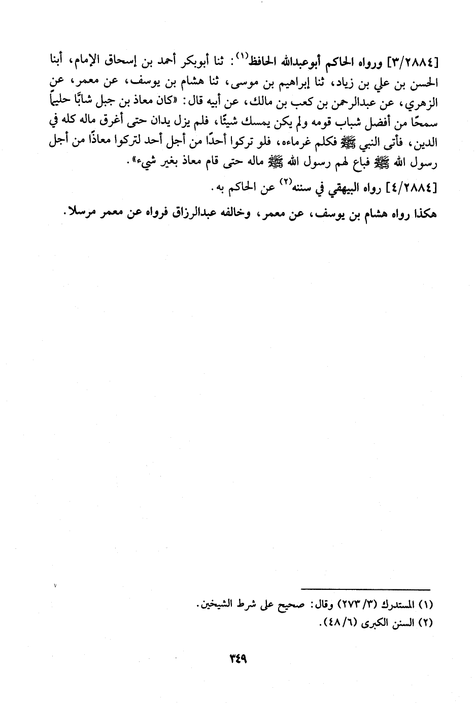 2884 / 3 - وَرَوَاهُ الْحَاكِمُ أَبُو عَبْدِ اللَّهِ الْحَافِظُ: ثَنَا أبو بكر أحمد بن إسحاق الإمام، أبنا الْحَسَنُ بْنُ عَلِيِّ بْنِ زِيَادٍ، ثنا إِبْرَاهِيمُ بْنُ مُوسَى، ثنا هِشَامُ بْنُ يُوسُفَ، عَنْ مَعْمَرٍ، عَنِ الزُّهْرِيِّ، عَنْ عَبْدِ الرَّحْمَنِ بْنِ كَعْبِ بْنِ مَالِكٍ، عَنْ أَبِيهِ قَالَ: "كَانَ مُعَاذُ بْنُ جَبَلٍ شابَّا حَلِيمًا سَمْحًا مِنْ أَفْضَلِ شَبَابِ قَوْمِهِ وَلَمْ يَكُنْ يُمْسِكُ شَيْئًا، فلم يزل يدان حَتَّى أَغْرَقَ مَالَهُ كُلَّهُ فِي الدَّيْنِ، فَأَتَى النَّبِيَّ - صَلَّى اللَّهُ عَلَيْهِ وَسَلَّمَ - فَكَلَّمَ غُرَمَاءَهُ، فَلَوْ تَرَكُوا أَحَدًا مِنْ أَجْلِ أَحَدٍ لَتَرَكُوا مُعَاذًا مِنْ أَجْلِ رَسُولِ اللَّهِ - صَلَّى اللَّهُ عَلَيْهِ وَسَلَّمَ - فَبَاعَ لَهُمْ رَسُولُ اللَّهِ - صَلَّى اللَّهُ عَلَيْهِ وَسَلَّمَ - ماله حتى قام معاذ بغير شيء".