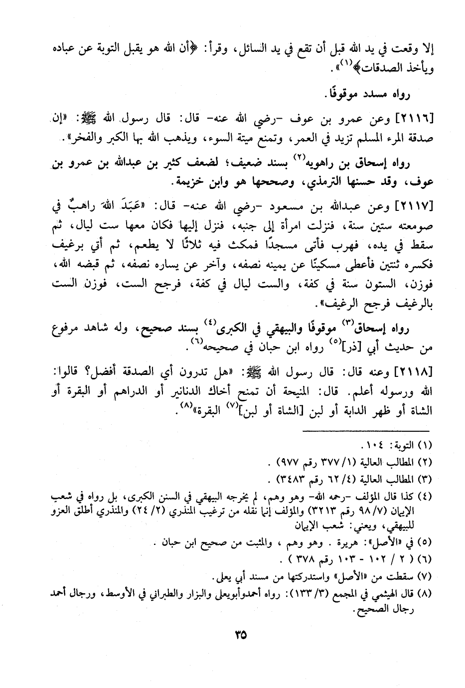 2116 - وَعَنْ عَمْرِو بْنِ عَوْفٍ- رَضِيَ اللَّهُ عَنْهُ- قَالَ: قَالَ رَسُولُ اللَّهِ - صَلَّى اللَّهُ عَلَيْهِ وَسَلَّمَ -: "إِنَّ صَدَقَةَ الْمَرْءِ الْمُسْلِمِ تَزِيدُ فِي الْعُمْرِ، وتَمْنَعُ مِيتَةَ السُّوءِ، وَيُذْهِبُ اللَّهُ بِهَا الْكِبْرَ وَالْفَخْرَ". رَوَاهُ إِسْحَاقُ بْنُ رَاهَوَيْهِ بِسَنَدٍ ضَعِيفٍ لِضَعْفِ كُثَيِّرِ بْنِ عَبْدِ اللَّهِ بْنِ عَمْروِ بْنِ عَوْفٍ، وَقَدْ حسنها الترمذي، وصححها هو وَابْنُ خُزَيْمَةَ.