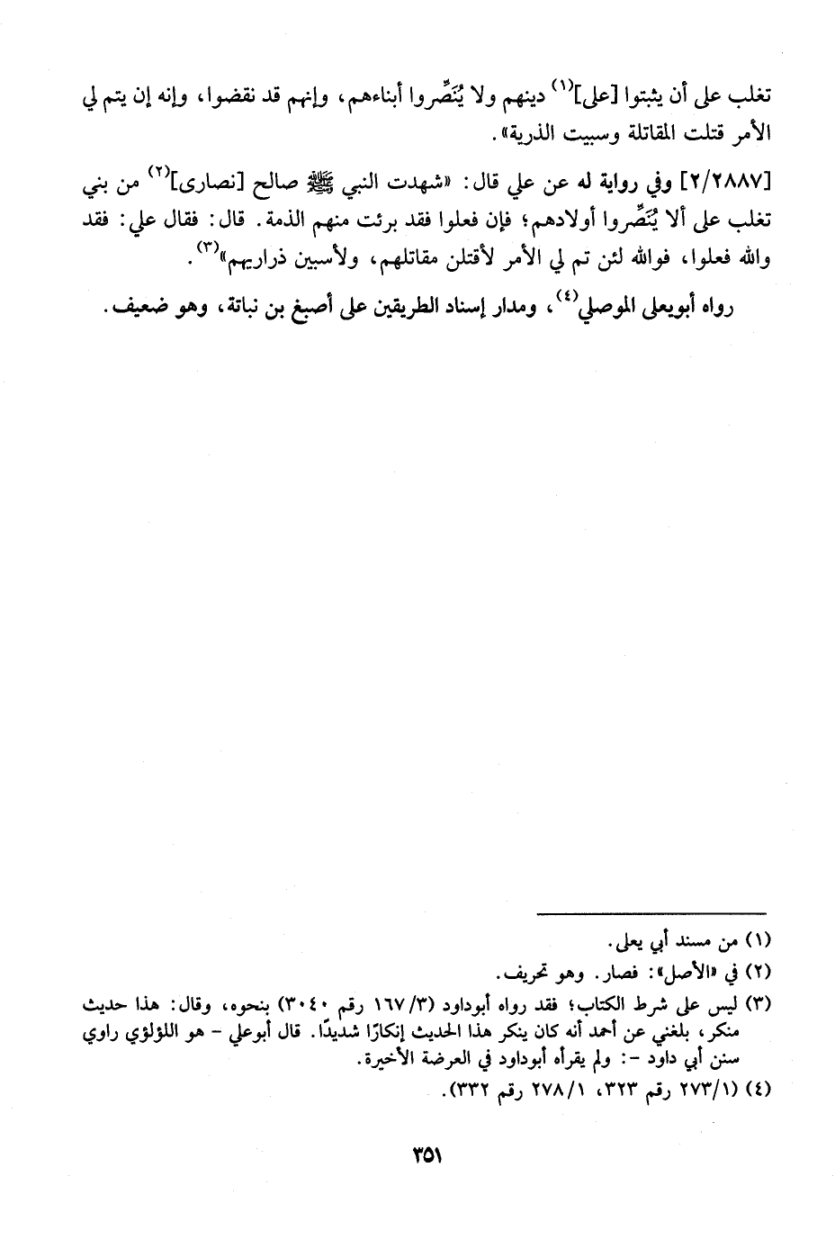 2887 / 2 - وَفِي رِوَايَةٍ لَهُ عَنْ عَلِيٍّ قَالَ: "شَهِدْتُ النَّبِيَّ - صَلَّى اللَّهُ عَلَيْهِ وَسَلَّمَ - صَالَحَ نَصَارًى من بني تغلب على ألا يُنَصِّروا أَوْلَادَهُمْ؛ فَإِنْ فَعَلُوا فَقَدْ بَرِئَتْ مِنُهُمُ الذِّمَّةُ. قَالَ: فَقَالَ عَلِيٌّ: فَقَدْ وَاللَّهِ فَعَلُوا، فوالله لئن تم لي الأمر لأقتلن مقاتلهم، وَلَأَسْبِيَنَّ ذَرَارِيَهُمْ ". رَوَاهُ أَبُو يَعْلَى الْمُوصِلِيُّ، وَمَدَارُ إِسْنَادِ الطَّرِيقَيْنِ عَلَى أَصْبَغِ بْنِ نُبَاتَةَ، وَهُوَ ضعيف.
