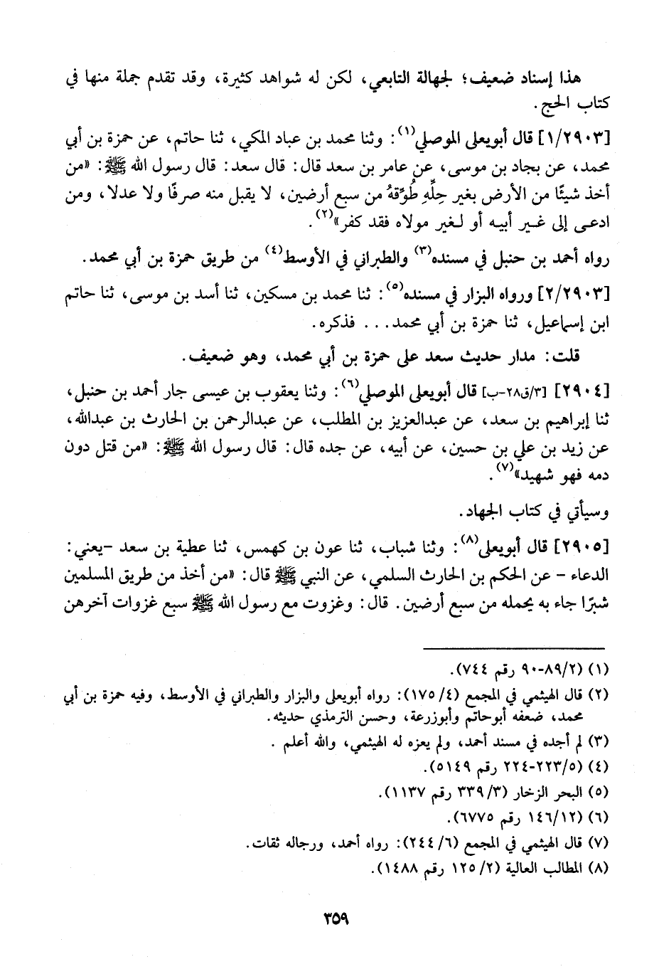 2905 - قَالَ أبو يعلى: وثنا شباب، ثنا عون بن كَهْمَسَ، ثنا عَطِيَّةُ بْنُ سَعْدٍ- يَعْنِي: الدُّعَاءَ- عَنِ الْحَكَمِ بْنِ الْحَارِثِ السُّلَمِيِّ، عَنِ النَّبِيِّ - صَلَّى اللَّهُ عَلَيْهِ وَسَلَّمَ - قَالَ: "مَنْ أَخَذَ من طريق المسلمين شبًرا جاء به يَحْمِلُهُ مِنْ سَبْعِ أَرْضِينَ. قَالَ: وَغَزَوْتُ مَعَ رَسُولِ اللَّهِ - صَلَّى اللَّهُ عَلَيْهِ وَسَلَّمَ - فيه سَبْعَ غَزَوَاتٍ آخِرُهُنَّ