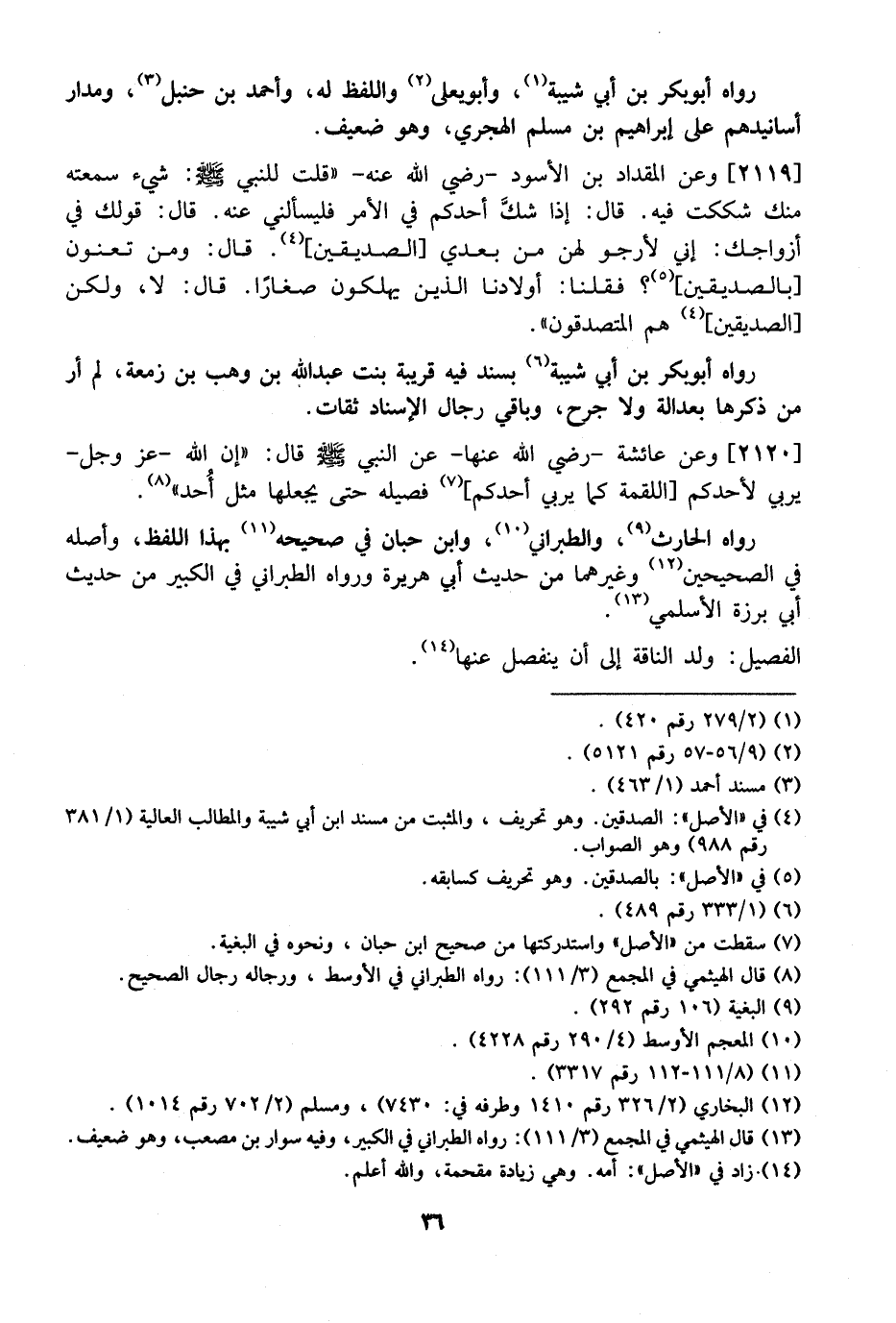 2119 - وَعَنِ الْمِقْدَادِ بْنِ الْأَسْوَدِ- رَضِيَ اللَّهُ عنه- "قُلْتُ لِلنَّبِيِّ - صَلَّى اللَّهُ عَلَيْهِ وَسَلَّمَ -: شَيْءٌ سَمِعْتُهُ مِنْكَ شَكَكْتُ فِيهِ. قَالَ: إِذَا شكَّ أَحَدُكُمْ فِي الْأَمْرِ فَلْيَسْأَلْنِي عَنْهُ. قَالَ: قَوْلُكَ فِي أَزْوَاجِكَ: إِنِّي لَأَرْجُو لَهُنَّ مِنْ بَعْدِي الصِّدِّيقِينَ،. قَالَ: وَمَنْ تَعْنُونَ بِالصِّدِّيقِينَ؟ فَقُلْنَا: أَوْلَادَنَا الَّذِينَ يَهْلِكُونَ صِغَارًا. قَالَ: لَا، وَلَكِنَّ الصِّدِّيقِينَ، هُمُ الْمُتَصَدِّقُونَ ". رَوَاهُ أَبُو بَكْرِ بْنُ أَبِي شَيْبَةَ بِسَنَدٍ فِيهِ قَرِيبَةُ بِنْتُ عَبْدِ اللَّهِ بْنِ وَهْبِ بْنِ زَمْعَةَ، لَمْ أَرَ مَنْ ذَكَرَهَا بِعَدَالَةٍ وَلَا جَرْحٍ، وَبَاقِي رِجَالِ الْإِسْنَادِ ثِقَاتٌ.