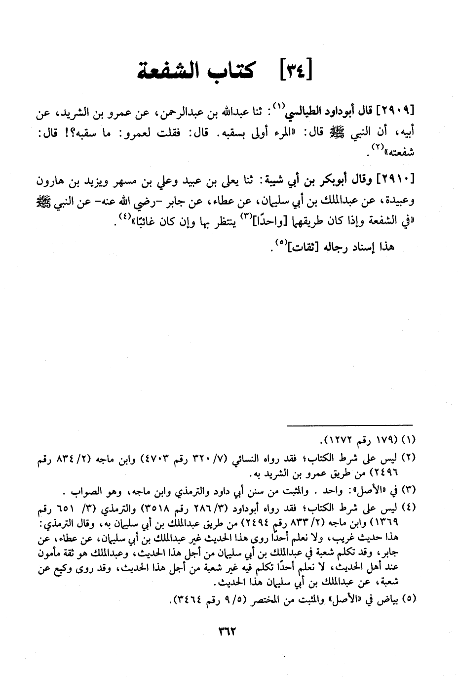 2910 - وَقَالَ أَبُو بَكْرِ بْنُ أَبِي شَيْبَةَ: ثنا يَعْلَى بْنُ عُبَيْدٍ وَعَلِيُّ بْنُ مِسْهَرٍ وَيَزِيدُ بْنُ هَارُونَ وَعُبَيْدَةُ، عَنْ عَبْدِ الْمَلِكِ بْنِ أَبِي سُلَيْمَانَ، عَنْ عَطَاءٍ، عَنْ جَابِرٍ- رَضِيَ اللَّهُ عَنْهُ- عَنِ النَّبِيِّ - صَلَّى اللَّهُ عَلَيْهِ وَسَلَّمَ - "فِي الشُّفْعَةِ وَإِذَا كَانَ طَرِيقُهُمَا وَاحِدًا يُنْتَظَرُ بِهَا وَإِنْ كَانَ غَائِبًا". هَذَا إِسْنَادٌ رجاله ثقات.
