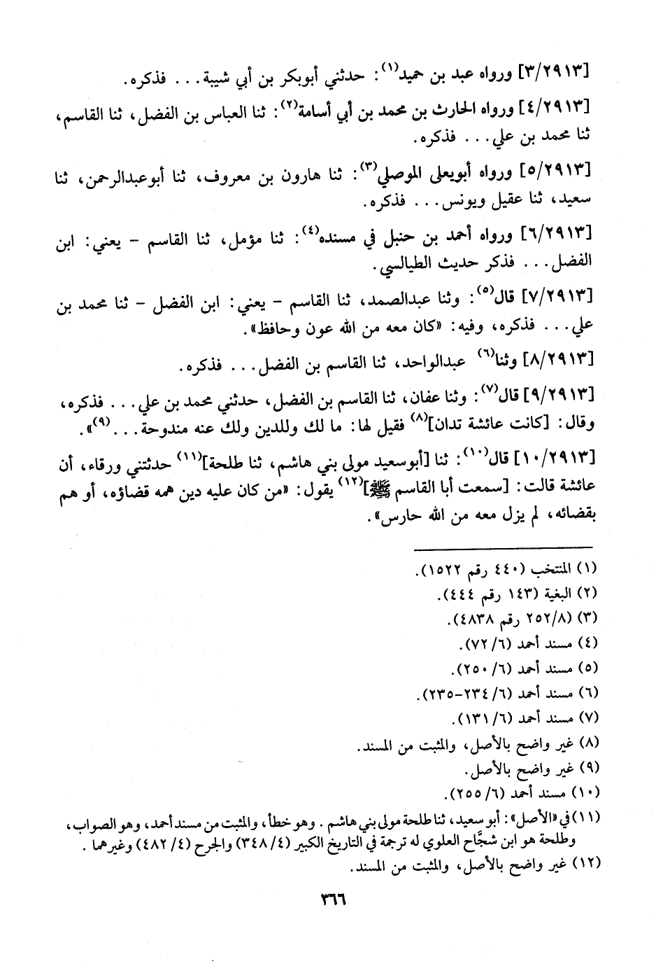 2913 / 9 - قال: وثنا عفان، ثنا القاسم بن الفضل، حدثني محمد بن علي ... فذكره، وقال: كانت عائشة تدان، فقيل لها: ما لك وللدين ولك عنه مندوحة 00. ".