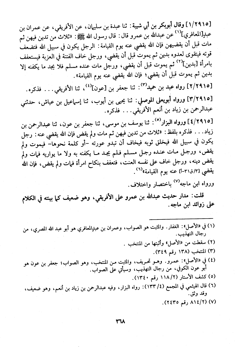 2915 / 1 - وَقَالَ أَبُو بَكْرِ بْنُ أَبِي شَيْبَةَ: ثنا عَبْدَةُ بْنُ سُلْيَمَانَ، عَنِ الْأَفْرِيقِيِّ، عَنْ عِمْرَانَ بْنِ عبدٍ الْمُعَافِرِيِّ، عَنْ عَبْدِ اللَّهِ بْنِ عَمْرٍو قَالَ: قَالَ رَسُولِ اللَّهِ - صَلَّى اللَّهُ عَلَيْهِ وَسَلَّمَ -: "ثَلَاثٌ مَنْ تُدِينَ فِيهِنَّ ثُمَّ مَاتَ قَبْلَ أَنْ يَقْضِيَهُنَّ فَإِنَّ اللَّهَ يَقْضِي عَنْهُ يَوْمَ الْقِيَامَةِ: الرَّجُلُ يَكُونُ فِي سَبِيلِ اللَّهِ فَتَضْعُفُ قُوَّتُهُ فَيَتَقَوَّى لِعَدُوِّهِ بِدَيْنٍ ثُمَّ يَمُوتُ قَبْلَ أَنْ يَقْضِيَ، وَرَجُلٌ خَافَ الْفِتْنَةَ في العزبة فيستعفف بامرأة بِدَيْنٍ ثُمَّ يَمُوتُ قَبْلَ أَنْ يَقْضِيَ، وَرَجُلٌ مَاتَ عِنْدَهُ مُسْلِمٌ فَلَا يَجِدُ مَا يُكَفِّنُهُ إِلَّا بِدَيْنٍ ثُمَّ يَمُوتُ قَبْلَ أَنْ يَقْضِيَ؟ فَإِنَّ اللَّهَ يَقْضِي عَنْهُ يَوْمَ الْقِيَامَةِ".