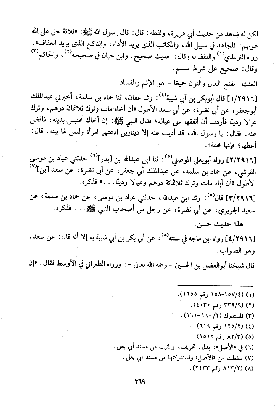 2916 / 1 - قَالَ أَبُو بَكْرِ بْنُ أَبِي شَيْبَةَ: وَثَنَا عَفَّانُ، ثَنَا حَمَّادُ بْنُ سَلَمَةَ، أَخْبَرَنِي عَبْدُ الْمَلِكِ أَبُو جَعْفَرٍ، عَنْ أَبِي نَضْرَةَ، عَنْ أَبِي سَعْدٍ الأطول "أن أخاه مات وترك ثلاثمائة دِرْهَمٍ، وَتَرَكَ عِيَالًا وَدَيْنًا فَأَرَدْتُ أَنْ أُنْفِقَهَا عَلَى عِيَالِهِ؛ فَقَالَ النَّبِيُّ - صَلَّى اللَّهُ عَلَيْهِ وَسَلَّمَ -: إِنَّ أَخَاكَ مُحْتَبَسٌ بِدَيْنِهِ، فَاقْضِ عَنْهُ. فَقَالَ: يَا رَسُولَ اللَّهِ، قَدْ أَدَّيْتُ عَنْهُ إِلَّا دِينَارَيْنِ ادَّعَتْهُمَا امْرَأَةٌ وَلَيْسَ لَهَا بَيِّنَةٌ. قَالَ: أَعْطِهَا؛ فَإِنَّهَا مُحِقَةٌ".