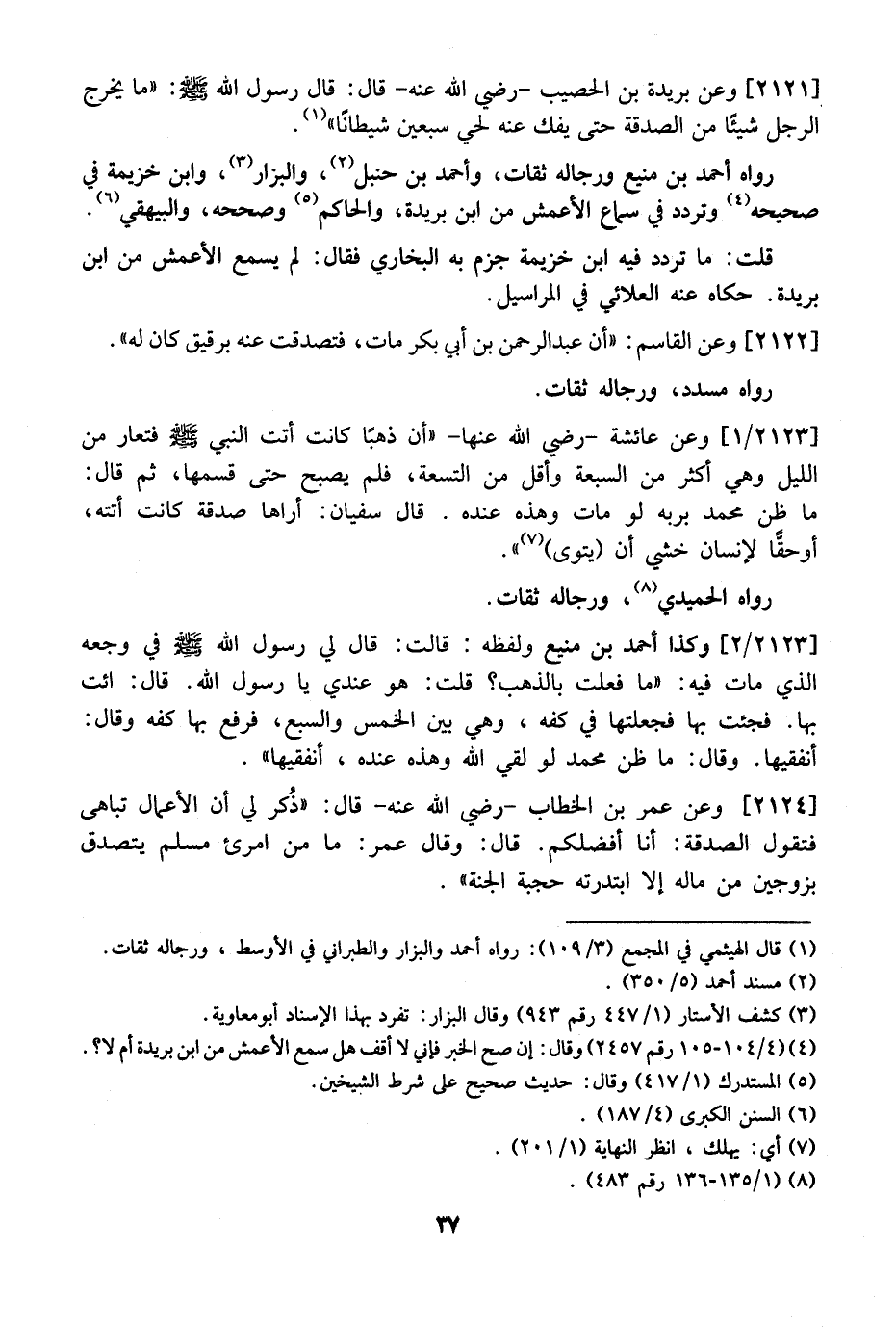 2121 - وعن بريدة بن الحصيب- رَضِيَ اللَّهُ عَنْهُ- قَالَ: قَالَ رَسُولُ اللَّهِ - صَلَّى اللَّهُ عَلَيْهِ وَسَلَّمَ -: "مَا يُخْرِجُ الرَّجُلُ شَيْئًا مِنَ الصَّدَقَةِ حَتَّى يُفَكَّ عَنْهُ لِحَى سَبْعِينَ شَيْطَانًا". رَوَاهُ أَحْمَدُ بْنُ مَنِيعٍ وَرِجَالُهُ ثِقَاتٌ، وَأَحْمَدُ بْنُ حَنْبَلَ، وَالْبَزَّارُ، وَابْنُ خُزَيْمَةَ فِي صَحِيحِهِ وَتَرَدَّدَ فِي سَمَاعِ الْأَعْمَشِ مِنَ ابْنِ بُرَيْدَةَ، وَالْحَاكِمُ وَصَحَّحَهُ، وَالْبَيْهَقِيُّ. قُلْتُ: مَا تَرَدَّدَ فِيهِ ابْنُ خُزَيْمَةَ جَزَمَ بِهِ الْبُخَارِيُّ فَقَالَ: لَمْ يَسْمَعِ الْأَعْمَشُ مِنَ ابْنِ بُرَيْدَةَ. حَكَاهُ عَنْهُ الْعَلَائِيُّ فِي الْمَرَاسِيلِ.