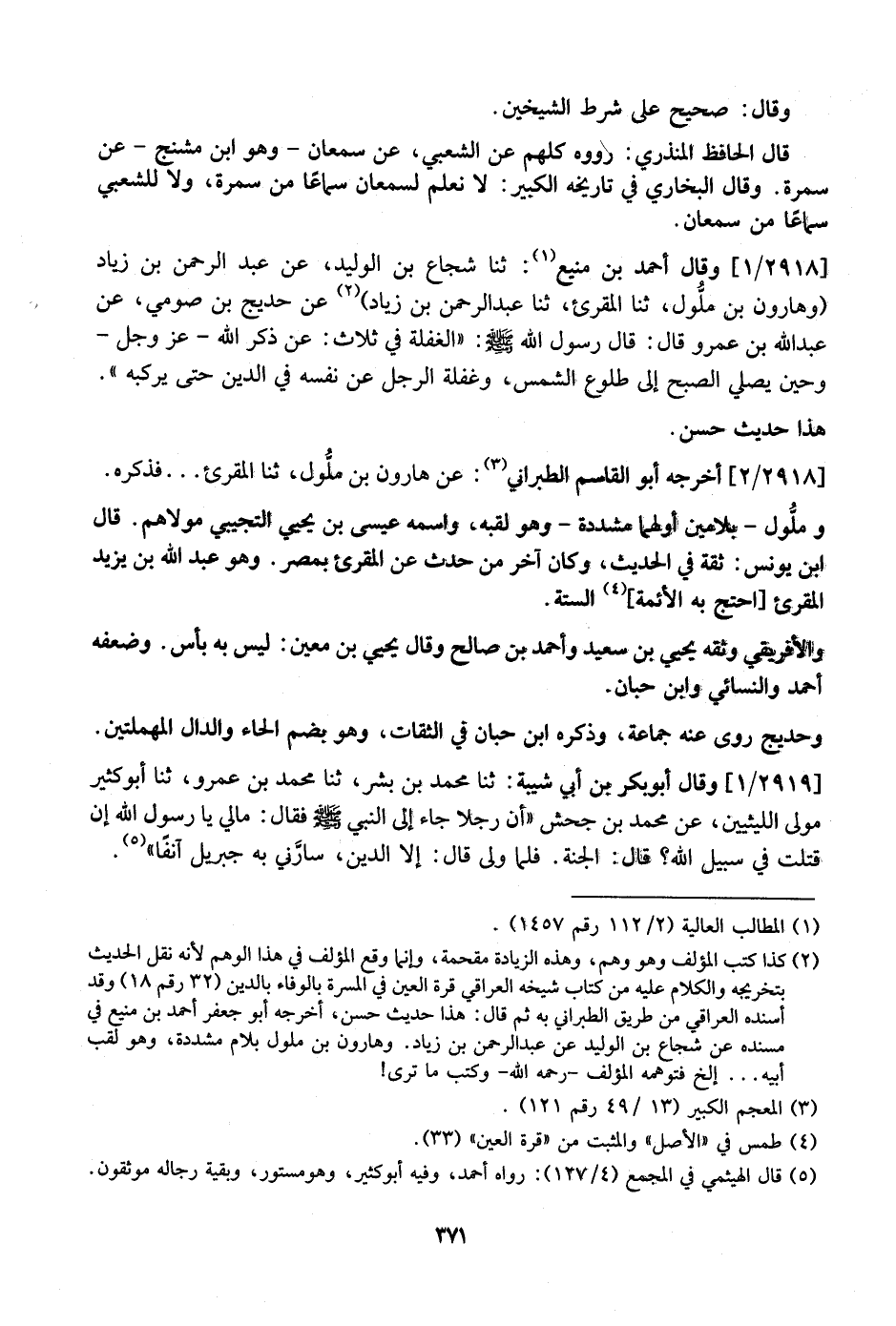 2918 / 1 - وَقَالَ أَحْمَدُ بْنُ مَنِيعٍ: ثَنَا شُجَاعُ بْنُ الْوَلِيدِ، عن عبد الرحمن بن زياد (وهارون بن ملُّول، ثنا الْمُقْرِئُ، ثَنَا عَبْدُ الرَّحْمَنِ بْنُ زِيَادٍ) عَنْ حديج بْنِ صُومى، عَنْ عَبْدِ اللَّهِ بْنِ عَمْرٍو قَالَ: قَالَ رَسُولُ اللَّهِ - صَلَّى اللَّهُ عَلَيْهِ وسلم -: "الغفلة في ثلاث: عَنْ ذِكْرِ اللَّهِ- عَزَّ وَجَلَّ- وَحِينَ يُصَلَّى الصُّبْحُ إِلَى طُلُوعِ الشَّمْسِ، وَغَفْلَةُ الرَّجُلِ عَنْ نَفْسِهِ فِي الدَّيْنِ حَتَّى يَرْكَبَهُ ". هَذَا حَدِيثٌ حسن.