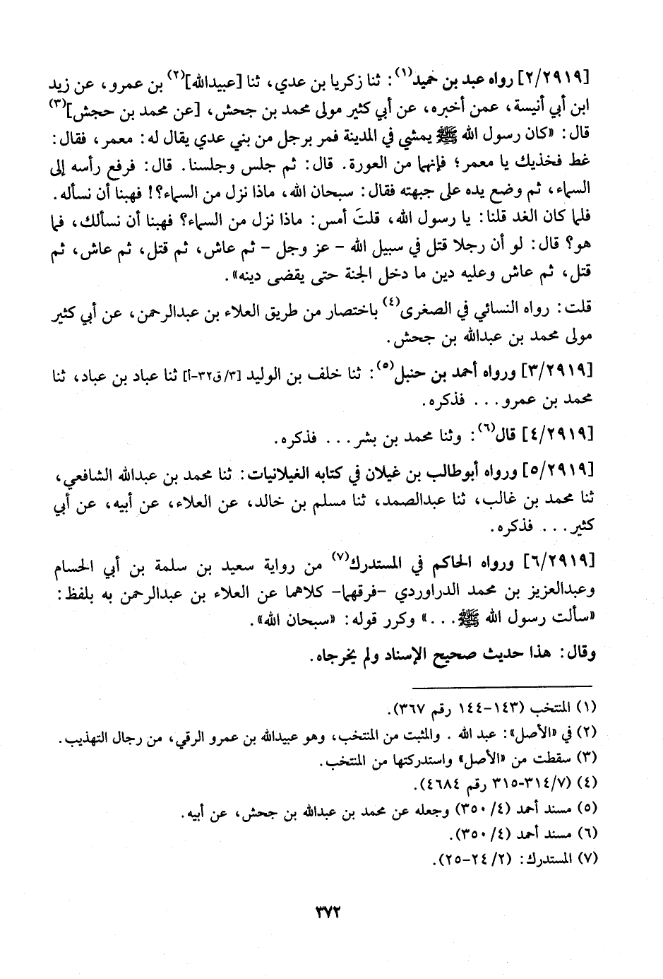 2919 / 6 - ورواه الحاكم في المستدرك من رواية سعيد بن سلمة بن أبي الحسام وعبد العزيز بن محمد الدراوردي- فرقهما- كلاهما عن العلاء بن عبد الرحمن به بلفظ: "سَأَلْتُ رَسُولَ اللَّهِ - صَلَّى اللَّهُ عَلَيْهِ وَسَلَّمَ - ... " وكرر قوله: "سبحان الله ". وَقَالَ: هَذَا حَدِيثٌ صَحِيحُ الْإِسْنَادِ وَلَمْ يُخَرِّجَاهُ.