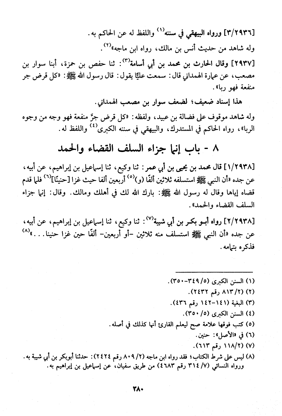 2938 / 2 - رَوَاهُ أَبُو بَكْرِ بْنُ أَبِي شَيْبَةَ: ثنا وَكِيعٌ، ثنا إِسْمَاعِيلُ بْنُ إِبْرَاهِيمَ، عَنْ أَبِيهِ، عَنْ جَدِّهِ "أَنّ النَّبِيَّ - صَلَّى اللَّهُ عَلَيْهِ وَسَلَّمَ - اسْتَسْلَفَ مِنْهُ ثلاثين- أَوْ أَرْبَعِينَ- أَلْفًا حِينَ غَزَا حُنَيْنًا ... " فَذَكَرَهُ بتمامه.