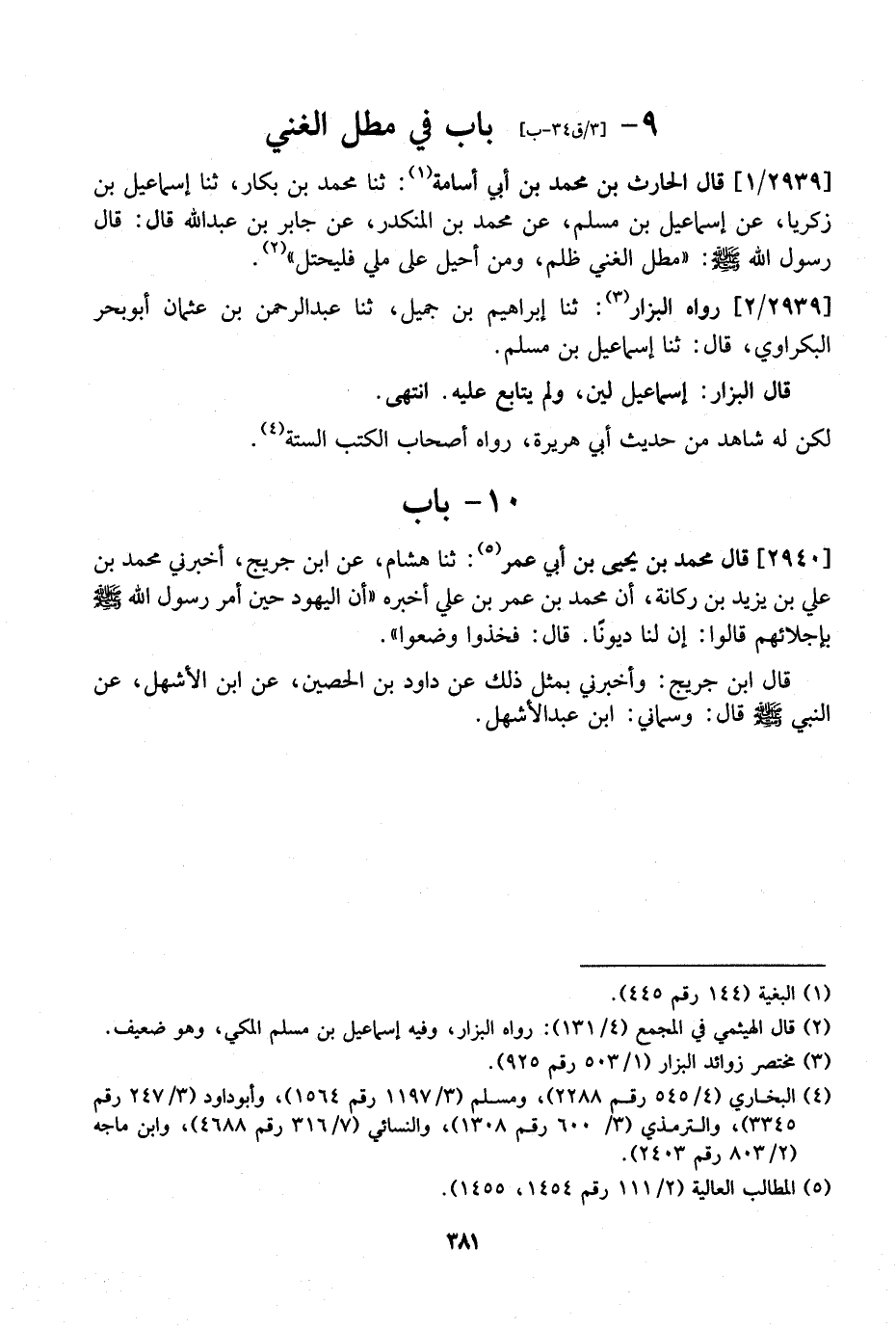 2839 / 1 - قَالَ الْحَارِثُ بْنُ مُحَمَّدِ بْنِ أَبِي أُسَامَةَ: ثَنَا مُحَمَّدُ بْنُ بَكَّارٍ، ثَنَا إِسْمَاعِيلُ بْنُ زكريا، عَنْ إِسْمَاعِيلَ بْنِ مُسْلِمٍ، عَنْ مُحَمَّدِ بْنِ الْمُنْكَدِرِ، عَنْ جَابِرِ بْنِ عَبْدِ اللَّهِ قَالَ: قَالَ رَسُولُ اللَّهِ - صَلَّى اللَّهُ عَلَيْهِ وَسَلَّمَ -: "مَطْلُ الْغِنَى ظُلْمٌ، وَمَنْ أُحِيلَ على ملي فَلْيَحْتَلْ ".