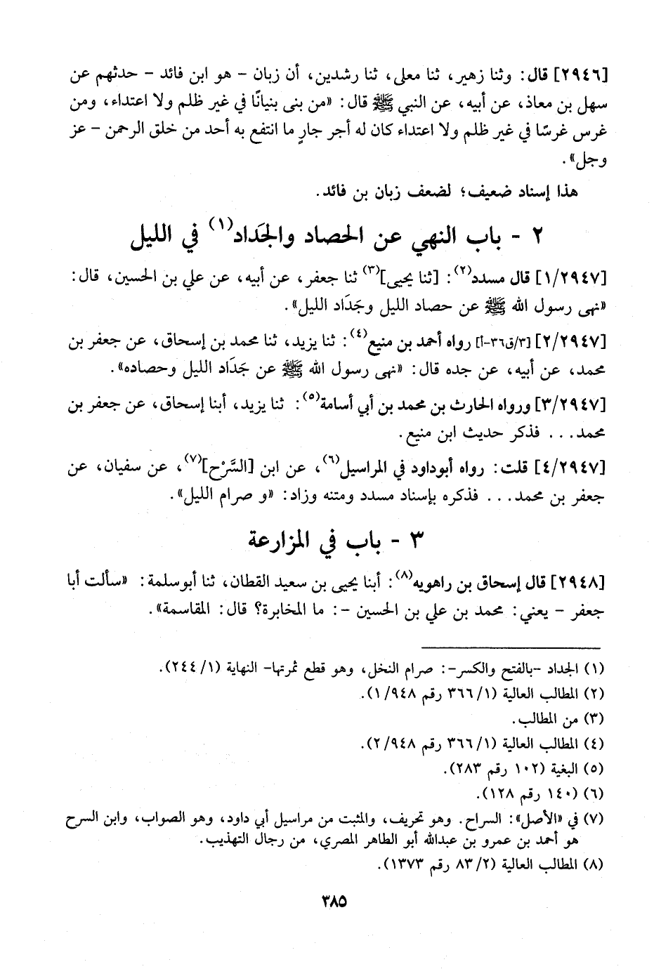 2947 / 1 - قَالَ مُسَدَّدٌ: ثنا يَحْيَى، ثَنَا جَعْفَرٌ، عَنْ أَبِيهِ، عَنْ عَلِيِّ بْنُ الْحُسَيْنِ، قَالَ: "نَهَى رَسُولُ اللَّهِ - صَلَّى اللَّهُ عَلَيْهِ وَسَلَّمَ - عَنْ حِصَادِ اللَّيْلِ وجَدَاد اللَّيْلِ".