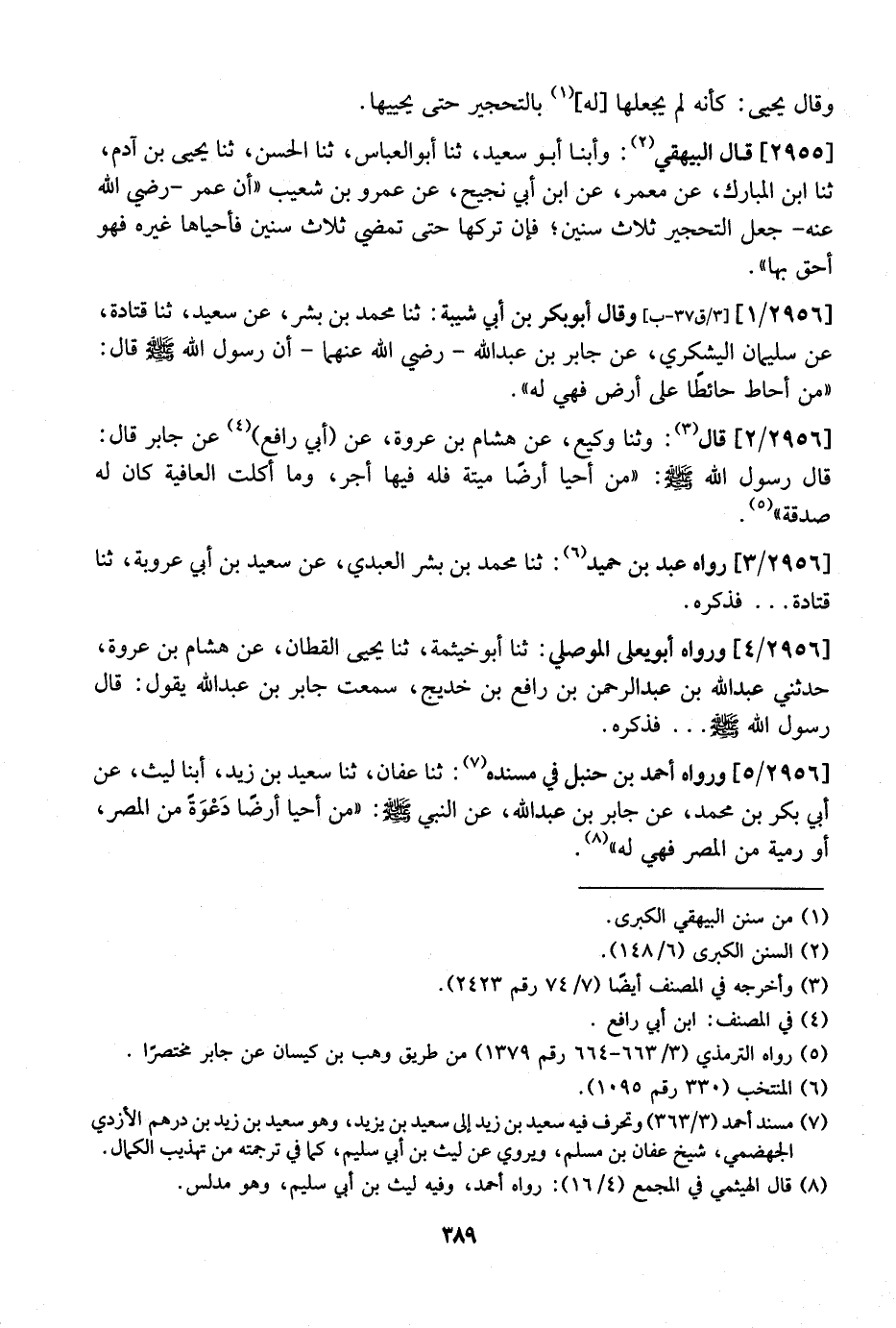 2955 - قال البيهقي: وأبنا أبو سعيد، ثنا أبو العباس، ثنا الحسن، ثَنَا يَحْيَى بْنُ آدَمَ، ثَنَا ابْنُ الْمُبَارَكِ، عَنْ مَعْمَرٍ، عَنِ ابْنِ أَبِي نَجِيحٍ، عَنْ عَمْرِو بْنِ شُعَيْبٍ "أَنَّ عُمَرَ- رَضِيَ اللَّهُ عَنْهُ- جَعَلَ التَّحْجِيرَ ثَلَاثَ سِنِينَ؛ فَإِنْ تَرَكَهَا حَتَّى تَمْضِيَ ثَلَاثُ سِنِينَ فَأَحْيَاهَا غَيْرُهُ فَهُوَ أَحَقُّ بِهَا".
