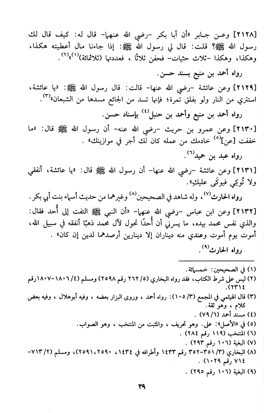 2128 - وَعَنْ جَابِرٍ "أَنَّ أَبَا بَكْرٍ- رَضِيَ اللَّهُ عَنْهُمَا- قَالَ لَهُ: كَيْفَ قَالَ لَكَ رَسُولُ اللَّهِ - صَلَّى اللَّهُ عَلَيْهِ وَسَلَّمَ -؟ قُلْتُ: قَالَ لِي رَسُولُ اللَّهِ - صَلَّى اللَّهُ عَلَيْهِ وَسَلَّمَ -: إِذَا جَاءَنَا مَالٌ أَعْطَيْتُهُ هَكَذَا، وَهَكَذَا، وَهَكَذَا- ثلاث حثيات- فحفن ثلاثًا، فعددتها (ثلاثمائة) ". رَوَاهُ أَحْمَدُ بْنُ مَنِيعٍ بِسَنَدٍ حَسَنٍ.