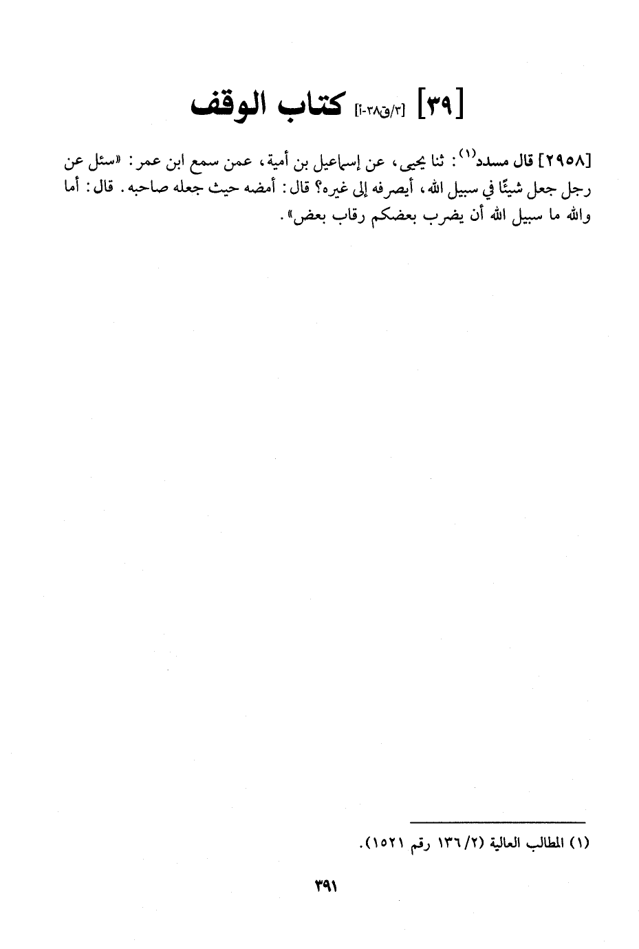 2958 - قَالَ مُسَدَّدٌ: ثنا يَحْيَى، عَنْ إِسْمَاعِيلَ بْنِ أُمَيَّةَ، عَمَّنْ سَمِعَ ابْنَ عُمَرَ: "سُئِلَ عَنْ رَجُلٍ جَعَلَ شَيْئًا فِي سَبِيلِ اللَّهِ، أَيَصْرِفُهُ إِلَى غَيْرِهِ؟ قَالَ: أَمْضِهِ حَيْثُ جَعَلَهُ صَاحِبُهُ. قَالَ: أَمَا وَاللَّهِ مَا سَبِيلُ اللَّهِ أَنْ يَضْرِبَ بَعْضُكُمْ رِقَابَ بَعْضٍ".