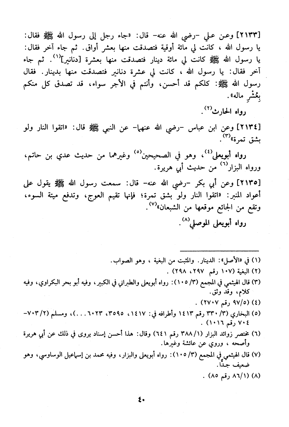 2133 - وَعَنْ عَلِيٍّ- رَضِيَ اللَّهُ عَنْهُ- قَالَ: "جَاءَ رَجُلٌ إِلَى رَسُولِ اللَّهِ - صَلَّى اللَّهُ عَلَيْهِ وَسَلَّمَ - فَقَالَ: يَا رَسُولَ اللَّهِ، كَانَتْ لِي مِائَةُ أُوقِيَّةٍ فَتَصَدَّقْتُ مِنْهَا بِعَشْرِ أَوَاقٍ. ثُمَّ جاء آخر فَقَالَ: يَا رَسُولَ اللَّهِ - صَلَّى اللَّهُ عَلَيْهِ وَسَلَّمَ - كَانَتْ لِي مِائَةُ دِينَارٍ فَتَصَدَّقْتُ مِنْهَا بِعَشَرَةِ دَنَانِيرَ،. ثُمَّ جَاءَ آخَرُ فَقَالَ: يَا رَسُولَ اللَّهِ، كَانَتْ لِي عَشَرَةُ دَنَانِيرَ فَتَصَدَّقْتُ مِنْهَا بِدِينَارٍ. فَقَالَ رَسُولُ اللَّهِ - صَلَّى اللَّهُ عَلَيْهِ وَسَلَّمَ -: كُلُّكُمْ قَدْ أَحْسَنَ، وَأَنْتُمْ فِي الْأَجْرِ سَوَاءٌ، قَدْ تَصَدَّقَ كُلٌّ مِنْكُمْ بِعُشْرِ مَالِهِ ". رواه الحارث.