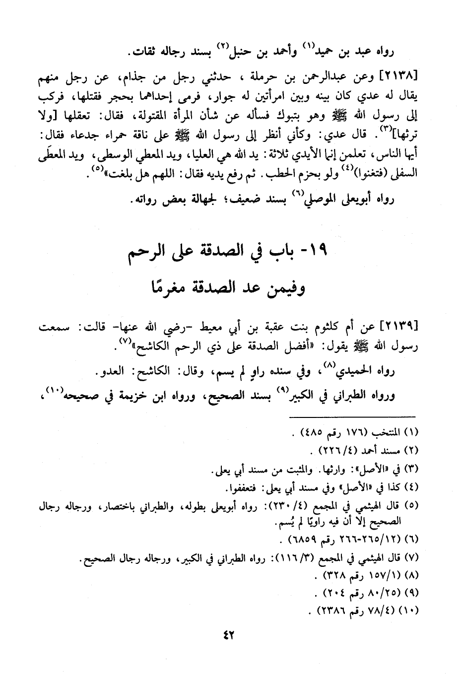 2138 - وَعَنْ عَبْدِ الرَّحْمَنِ بْنِ حَرْمَلَةَ، حَدَّثَنِي رَجُلٌ مِنْ جُذَامٍ، عَنْ رَجُلٍ مِنْهُمْ يُقَالُ لَهُ عَدِيُّ كَانَ بَيْنَهُ وَبَيْنَ امْرَأَتَيْنِ لَهُ جِوَارٌ، فَرَمَى إِحْدَاهُمَا بِحَجَرٍ فَقَتَلَهَا، فَرَكِبَ إِلَى رَسُولِ اللَّهِ - صَلَّى اللَّهُ عَلَيْهِ وَسَلَّمَ - وهو بتبوك فسأله عن شأن المرأة الْمَقْتُولَةِ، فَقَالَ: تَعْقِلُهَا وَلَا تَرِثُهَا،. قَالَ عَدِيٌّ: وَكَأَنِّي أَنْظُرُ إِلَى رَسُولِ اللَّهِ - صَلَّى اللَّهُ عَلَيْهِ وَسَلَّمَ - عَلَى نَاقَةٍ حَمْرَاءَ جَدْعَاءَ فَقَالَ: أَيُّهَا النَّاسُ، تَعَلَّمْنَ إِنَّمَا الْأَيْدِي ثَلَاثَةٌ: يَدُ اللَّهِ هِيَ الْعُلْيَا، وَيَدُ الْمُعْطِي الْوُسْطَى، وَيَدُ المعطَى السُّفْلَى (فَتَغَنَّوْا) وَلَوْ بِحِزَمِ الْحَطَبِ. ثُمَّ رَفَعَ يَدَيْهِ فَقَالَ: اللَّهُمَّ هَلْ بَلَّغْتُ ". رَوَاهُ أَبُو يَعْلَى الْمَوْصِلِيُّ بِسَنَدٍ ضَعِيفٍ، لِجَهَالَةِ بَعْضِ رُوَاتِهِ.
