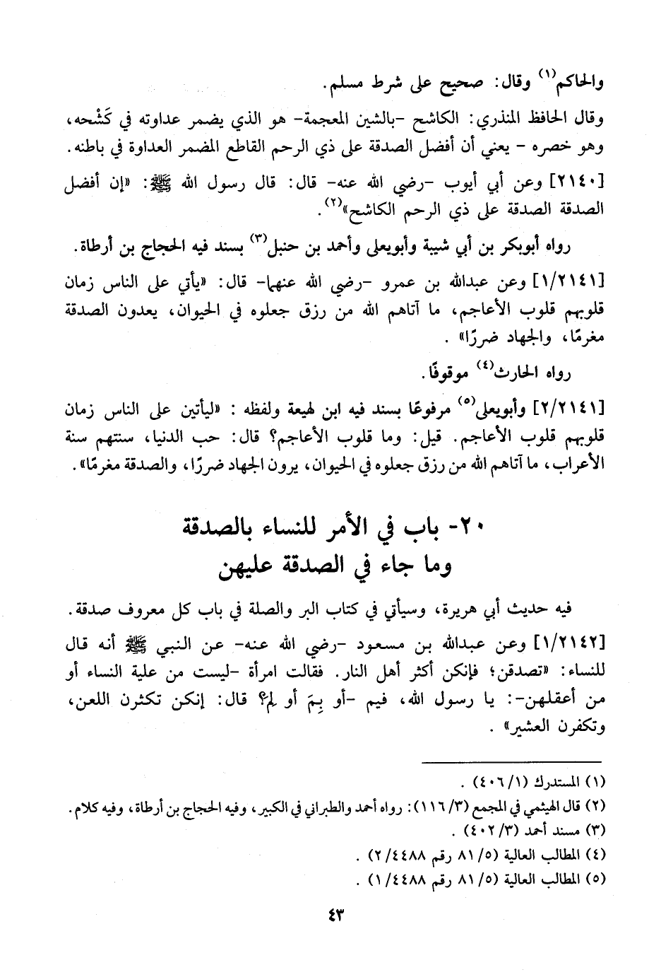 2140 - وَعَنْ أَبِي أَيُّوبَ- رَضِيَ اللَّهُ عَنْهُ- قَالَ: قَالَ رَسُولُ اللَّهِ - صَلَّى اللَّهُ عَلَيْهِ وَسَلَّمَ -: إِنَّ أَفْضَلَ الصَّدَقَةِ الصَّدَقَةُ عَلَى ذِي الرَّحِمِ الْكَاشِحِ ". رَوَاهُ أَبُو بَكْرِ بْنُ أَبِي شَيْبَةَ وَأَبُو يَعْلَى وَأَحْمَدُ بن حنبل بسند فيه الحجاج بن أرطاة.