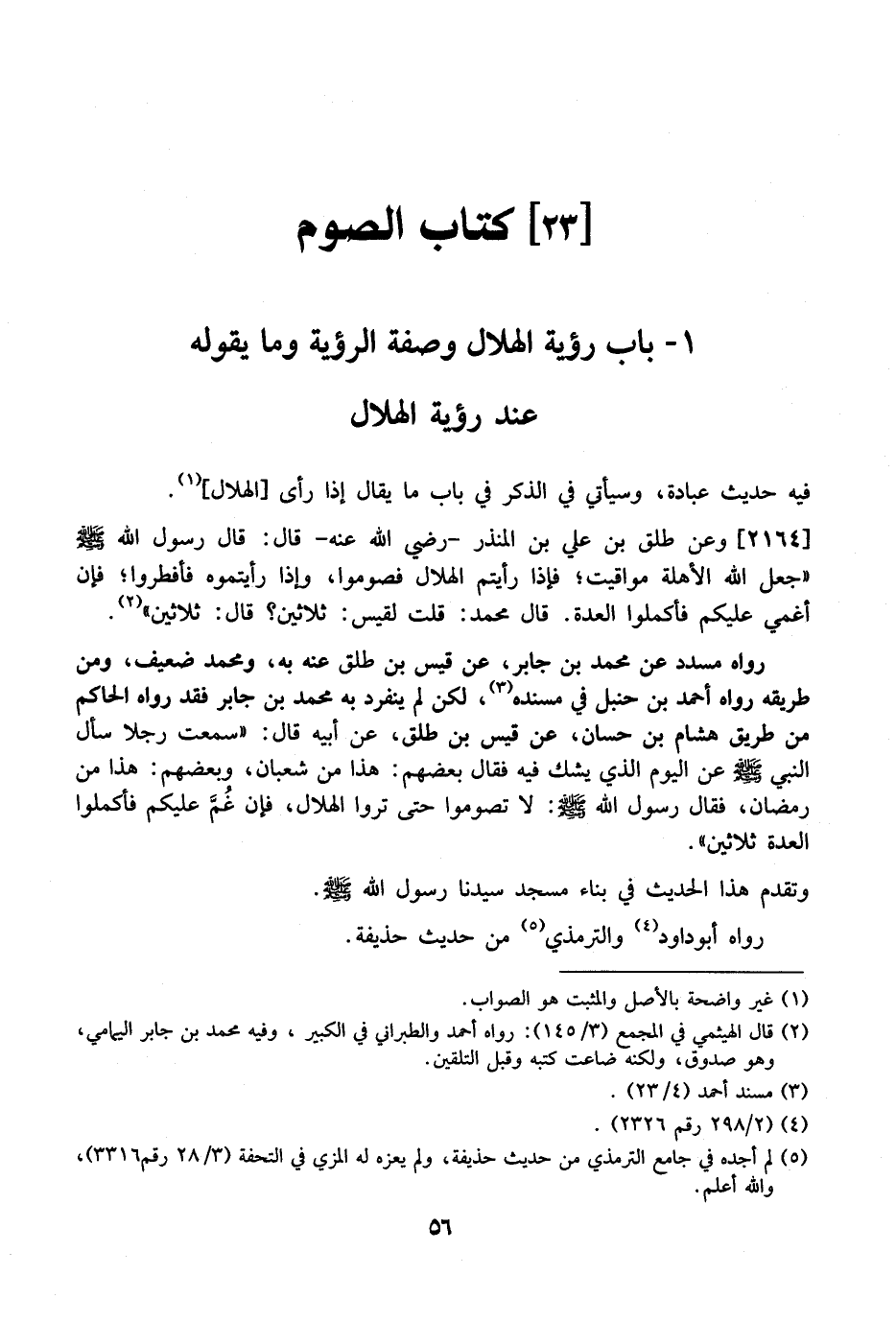 2164 - وعن طَلْقِ بْنِ عَلِيِّ بْنِ الْمُنْذِرِ- رَضِيَ اللَّهُ عَنْهُ- قَالَ: قَالَ رَسُولُ اللَّهِ - صَلَّى اللَّهُ عَلَيْهِ وَسَلَّمَ - "جَعَلَ اللَّهُ الْأَهِلَّةَ مَوَاقِيتَ فَإِذَا رَأَيْتُمُ الْهِلَالَ فَصُومُوا، وَإِذَا رَأَيْتُمُوهُ فَأَفْطِرُوا؛ فَإِنْ أُغْمِيَ عَلَيْكُمْ فَأَكْمِلُوا الْعِدَّةَ. قَالَ مُحَمَّدٌ: قُلْتُ لِقَيْسٍ: ثَلَاثِينَ؟ قَالَ: ثَلَاثِينَ ". رَوَاهُ مُسَدَّدٌ عَنْ مُحَمَّدِ بْنِ جَابِرٍ، عَنْ قَيْسِ بْنِ طَلْقٍ عَنْهُ بِهِ، وَمُحَمَّدٌ ضَعِيفٌ، وَمِنْ طَرِيقِهِ رَوَاهُ أَحْمَدُ بْنُ حَنْبَلٍ فِي مُسْنَدِهِ، لَكِنْ لَمْ يَنْفَرِدْ بِهِ مُحَمَّدُ بْنُ جَابِرٍ فَقَدْ رَوَاهُ الْحَاكِمُ مِنْ طَرِيقِ هِشَامِ بْنِ حَسَّانٍ، عَنْ قَيْسِ بْنِ طَلْقٍ، عَنْ أَبِيهِ قَالَ: "سَمِعْتُ رَجُلًا سَأَلَ النَّبِيَّ - صَلَّى اللَّهُ عَلَيْهِ وَسَلَّمَ - عَنْ الْيَوْمِ الَّذِي يُشَكُّ فِيهِ فَقَالَ بَعْضُهُمْ: هَذَا مِنْ شَعْبَانَ، وَبَعْضُهُمْ: هَذَا مِنْ رَمَضَانَ، فَقَالَ رَسُولُ اللَّهِ - صَلَّى اللَّهُ عَلَيْهِ وَسَلَّمَ -: لَا تَصُومُوا حَتَّى تَرَوُا الْهِلَالَ، فَإِنْ غُمَّ عَلَيْكُمْ فَأَكْمِلُوا الْعِدَّةَ ثَلَاثِينَ ". وَتَقَدَّمَ هَذَا الْحَدِيثُ فِي بِنَاءِ مَسْجِدِ سَيَّدِنَا رَسُولِ اللَّهِ - صَلَّى اللَّهُ عَلَيْهِ وَسَلَّمَ -. رَوَاهُ أبو دَاوُدَ وَالتِّرْمِذِيُّ مِنْ حَدِيثِ حُذَيْفَةَ.
