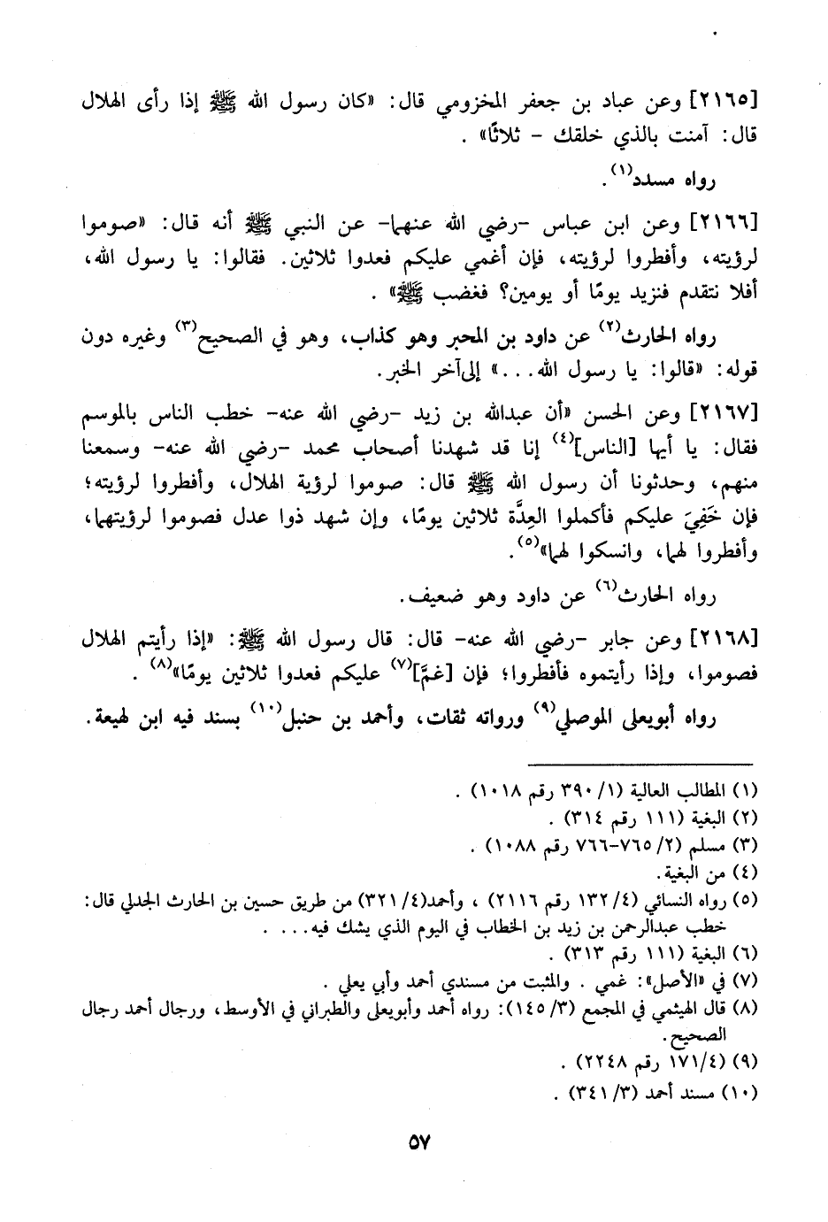 2165 - وَعَنْ عَبَّادِ بْنِ جَعْفَرَ الْمَخْزُومِيِّ قَالَ: "كَانَ رَسُولُ اللَّهِ - صَلَّى اللَّهُ عَلَيْهِ وسلم - إذا رَأَى الْهِلَالَ قَالَ: آمَنْتُ بِالَّذِي خَلَقَكَ- ثَلَاثًا". رَوَاهُ مُسَدَّدٌ.
