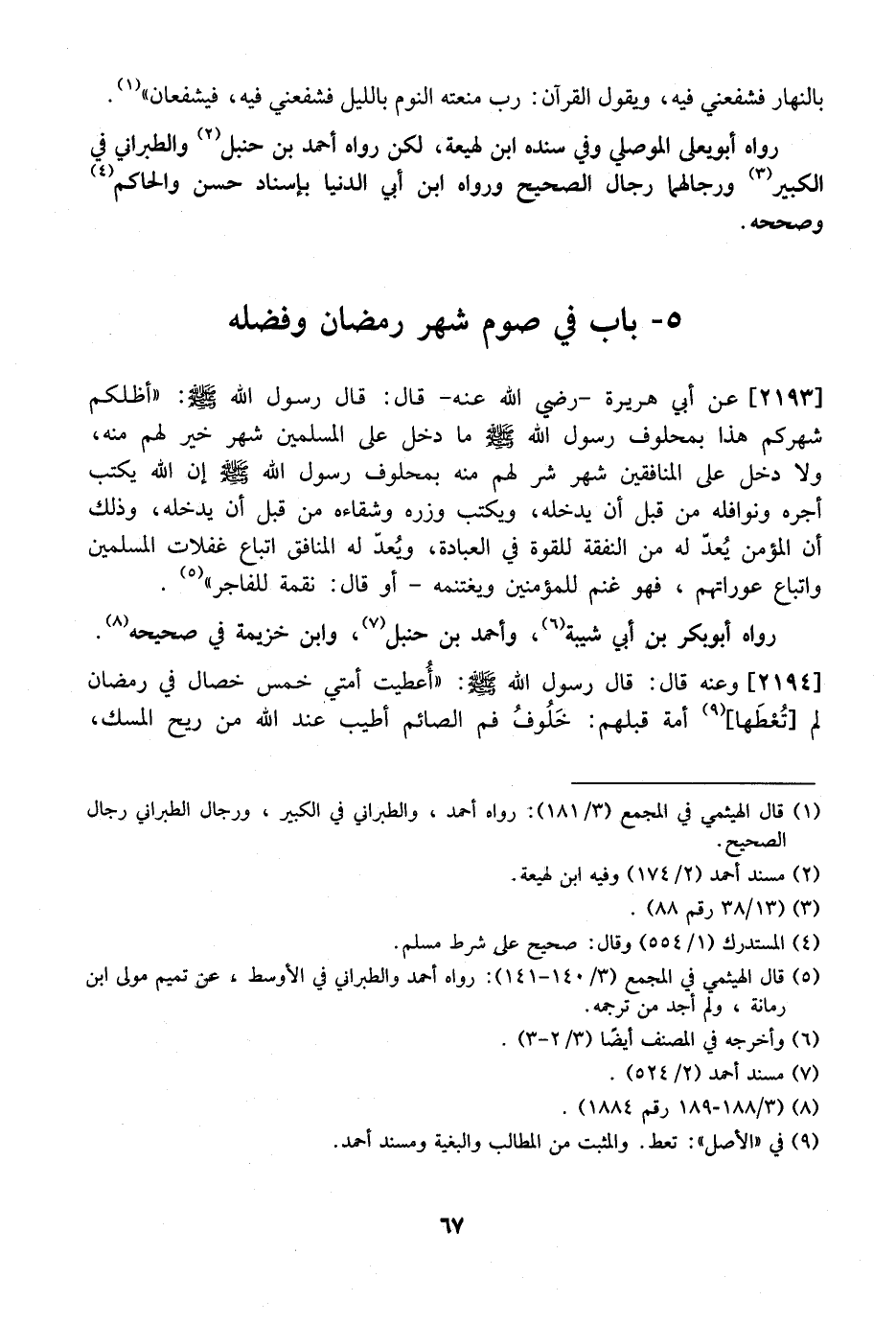 بِالنَّهَارَ فَشَفِّعْنِي فِيهِ، وَيَقُولُ الْقُرْآنُ: رَبِّ مَنَعْتُهُ النَّوْمَ بِاللَّيْلِ فَشَفِّعْنِي فِيهِ، فَيَشْفَعَانِ ". رَوَاهُ أَبُو يَعْلَى الْمَوْصِلِيُّ وَفِي سَنَدَهُ ابْنُ لَهْيَعَةَ، لَكِنْ رَوَاهُ أَحْمَدُ بْنُ حنبل والطبراني في الكبير وَرِجَالُهُمَا رِجَالُ الصَّحِيحِ وَرَوَاهُ ابْنُ أَبِي الدُّنْيَا بِإِسْنَادٍ حَسَنٍ وَالْحَاكِمُ وَصَحَّحَهُ.