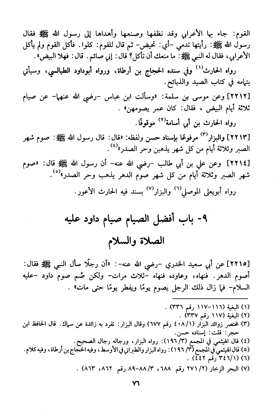 القوم: جَاءَ بِهَا الْأَعْرَابِيُّ وَقَدْ نَظَّفَهَا وَصَنَعَهَا وَأَهْدَاهَا إِلَى رَسُولِ اللَّهِ - صَلَّى اللَّهُ عَلَيْهِ وَسَلَّمَ - فَقَالَ رَسُولُ اللَّهِ - صَلَّى اللَّهُ عَلَيْهِ وَسَلَّمَ -: رَأَيْتُهَا تُدْمِي- أَيْ: تَحِيضُ- ثُمَّ قَالَ لِلْقَوْمِ: كُلُوا. فَأَكَلَ الْقَوْمُ وَلَمْ يَأْكُلِ الْأَعْرَابِيُّ، فَقَالَ لَهُ النَّبِيُّ - صَلَّى اللَّهُ عَلَيْهِ وَسَلَّمَ -: ما مَنَعَكَ أَنْ تَأْكُلَ؟ قَالَ: إِنِّي صَائِمٌ. قَالَ: فَهَّلَا الْبِيضُ ". رَوَاهُ الْحَارِثُ وَفِي سَنَدِهِ الْحَجَّاجُ بْنُ أَرْطَاةَ، وَرَوَاهُ أَبُو دَاوُدَ الطَّيَالِسِيُّ، وَسَيَأْتِي بِتَمَامِهِ فِي كِتَابِ الصَّيْدِ وَالذَّبَائِحِ.