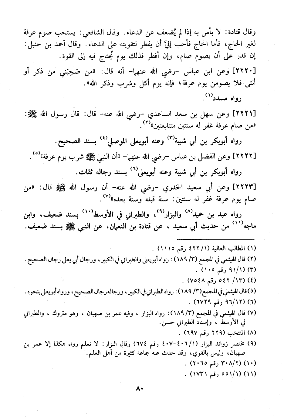 2222 - وَعَنِ الْفَضْلِ بْنِ عَبَّاسٍ- رَضِيَ اللَّهُ عَنْهُمَا- "أَنَّ النَّبِيَّ - صَلَّى اللَّهُ عَلَيْهِ وَسَلَّمَ - شَرِبَ يَوْمَ عَرَفَةَ". رَوَاهُ أَبُو بَكْرِ بْنُ أَبِي شَيْبَةَ وَعَنْهُ أَبُو يَعْلَى بِسَنَدٍ رِجَالُهُ ثِقَاتٌ.