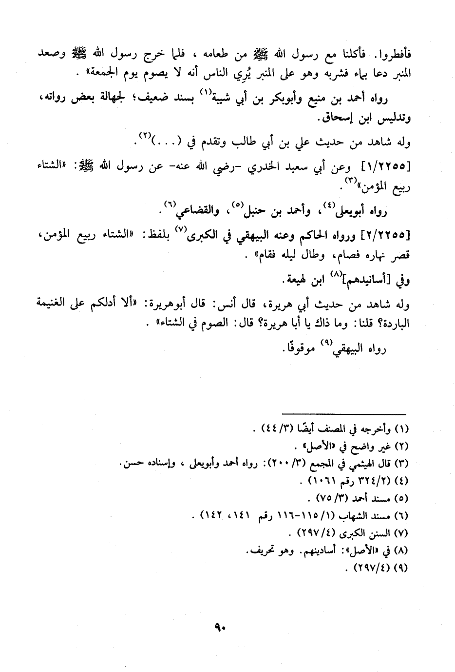 2255 / 2 - وَرَوَاهُ الحاكم وعنه البيهقي في الكبرى بلفظ: "الشِّتَاءُ رَبِيعُ الْمُؤْمِنِ، قَصُرَ نَهَارُهُ فَصَامَ، وَطَالَ ليله فقام ".