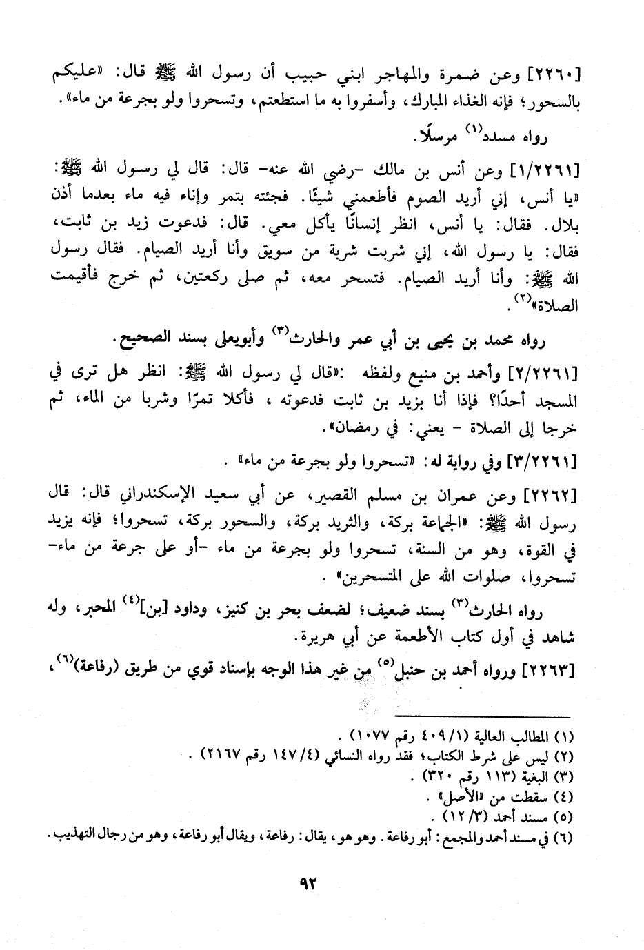 2260 - وَعَنْ ضُمْرَةَ وَالْمُهَاجِرِ ابْنَيْ حَبِيبٍ أَنَّ رَسُولَ اللَّهِ - صَلَّى اللَّهُ عَلَيْهِ وَسَلَّمَ - قَالَ: "عَلَيْكُمْ بالسحور؛ فإنه الغذاء المبارك، وأسفروا به ما اسْتَطَعْتُمْ، وَتَسَحَّرُوا وَلَوْ بِجُرْعَةٍ مِنْ مَاءٍ". رَوَاهُ مُسَدَّدٌ مُرْسَلًا.