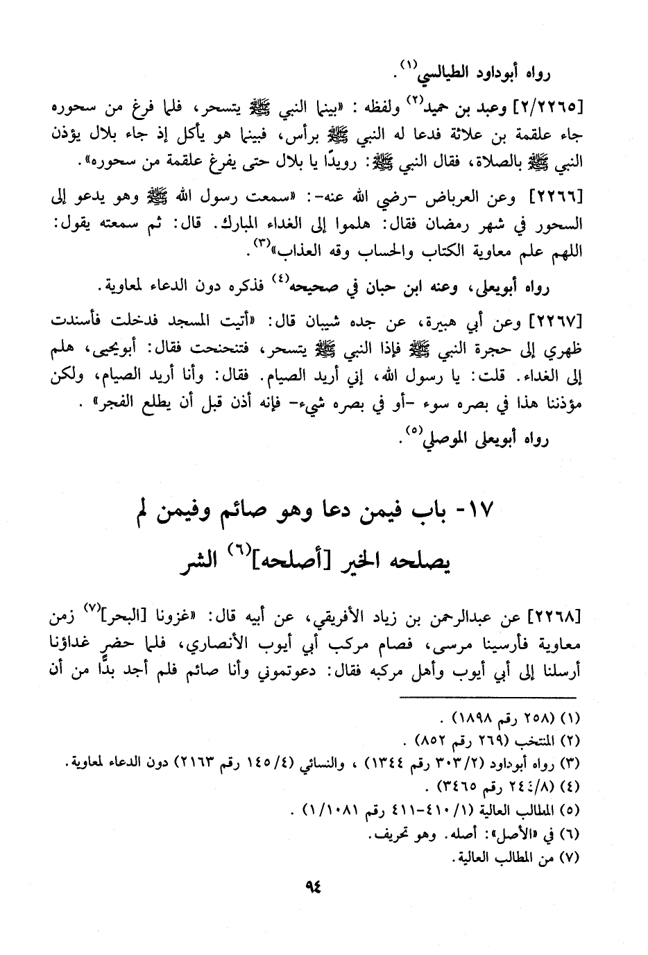 2268 - عَنْ عَبْدِ الرَّحْمَنِ بْنِ زِيَادٍ الْأَفْرِيقِيِّ، عَنْ أَبِيهِ قال: "غزونا البحرأ زمن معاوية فأرسينا مرسى، فَصَامَ مَرْكِبُ أَبِي أَيُّوبٍ الْأَنْصَارِيِّ، فَلَمَّا حضرٍ غَدَاؤُنَا أَرْسَلْنَا إِلَى أَبِي أَيُّوبَ وأهلِ مَرْكِبِهِ فَقَالَ: دَعَوْتُمُونِي وَأَنَا صَائِمٌ فَلَمْ أَجِدْ بُدًّا مِنْ أَنْ