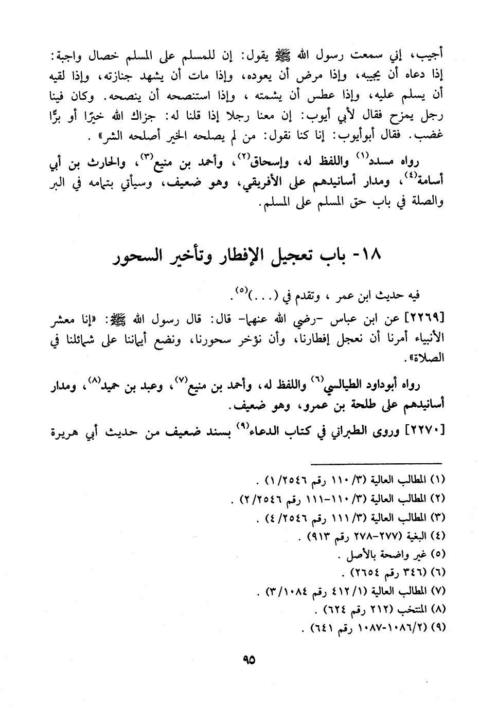 2269 - عَنِ ابْنِ عَبَّاسٍ- رَضِيَ اللَّهُ عَنْهُمَا- قَالَ: قَالَ رَسُولُ اللَّهِ - صَلَّى اللَّهُ عَلَيْهِ وَسَلَّمَ - "إِنَّا مَعْشَرَ الْأَنْبِيَاءِ أُمِرْنَا أَنْ نُعَجِّلَ إِفْطَارَنَا، وَأَنْ نُؤَخِّرَ سَحُورَنَا، وَنَضَعَ أَيْمَانَنَا عَلَى شَمَائِلِنَا فِي الصَّلَاةِ". رَوَاهُ أَبُو دَاوُدَ الطَّيَالِسِيُّ وَاللَّفْظُ لَهُ، وَأَحْمَدُ بْنُ مَنِيعٍ، وَعَبْدٌ بْنُ حَمِيدٍ، وَمَدَارُ أَسَانِيدِهِمْ عَلَى طَلْحَةَ بْنِ عَمْروٍ، وَهُوَ ضَعِيفٌ.